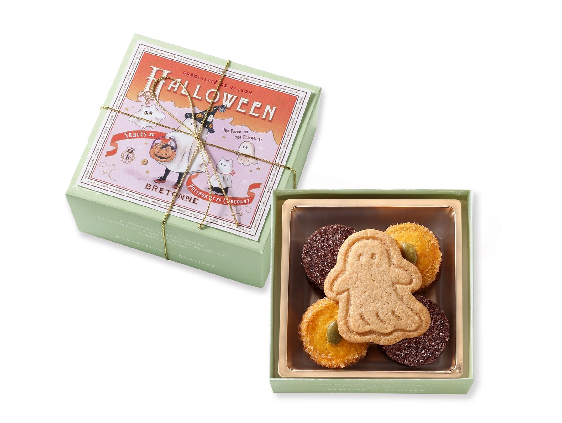 スパイスがほのかに香るおばけのクッキー、かぼちゃの優しい甘みが広がるサブレ、ショコラのほろ苦さとザラメ糖の甘みがアクセントのサブレの3種を詰め合わせたハロウイーン限定の小箱です。おばけに仮装した魔法使いの女の子と仲間たちのイラストが添えられた可愛いパッケージに詰めました。