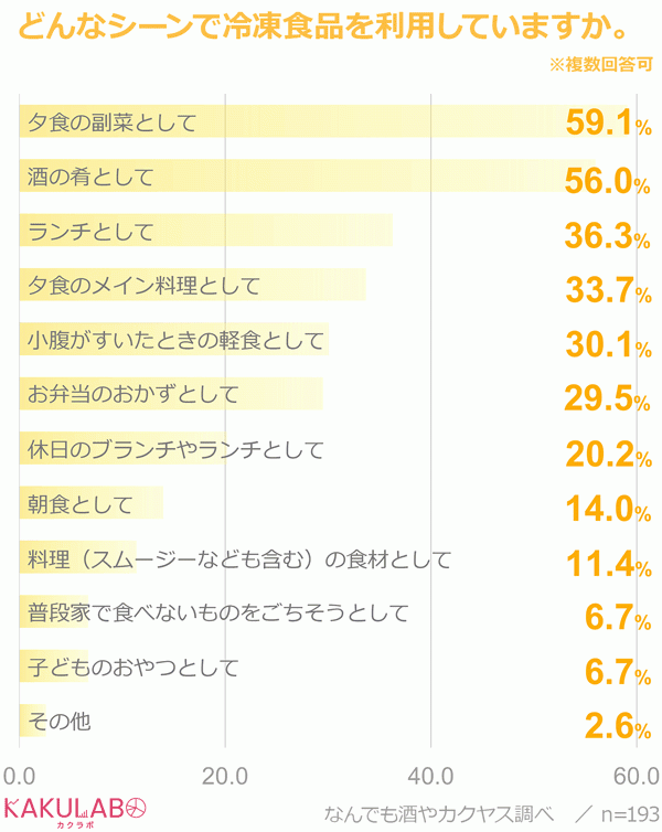 では、どんなシーンで冷凍食品を利用しているのでしょうか。複数回答可で聞いてみたところ、最も多かったのは「夕食の副菜として」で59%、次いで「酒の肴として」が56%でした。「酒の肴として」に多くの票が集まったのは、お酒が好きなカクヤスユーザーらしい結果ですが、コロナ禍で家飲みせざるを得ない状況が続いていることの証ともいえるのではないでしょうか。