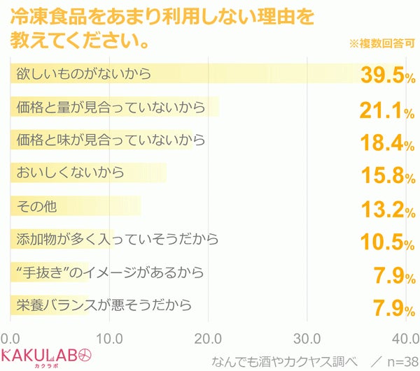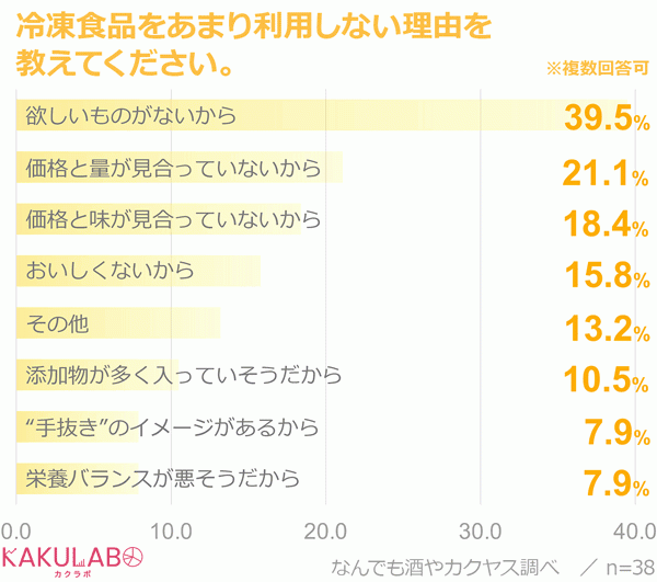 こうした利便性の高さから冷凍食品を利用する人が多い一方で、あまり利用しない人もいます。その理由を複数回答可で聞いてみたところ、最も多かったのは「欲しいものがないから」で40%でした。