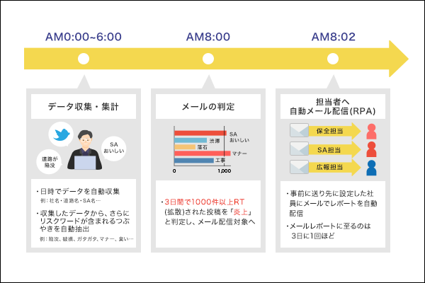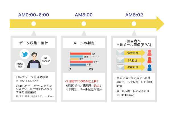 - 「3日間で1000RT」という閾値を超えた反応があった投稿を対象に、担当者へメールレポートを毎日自動配信することで、ポジティブ・ネガティブを問わず、SNSの炎上を自動で検知・担当者へ通知し、即時対応につなげる仕組みを構築。
