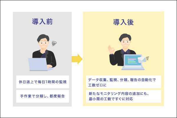 これにより、「Twitterで炎上する可能性のあるつぶやき」を自動検知して共有する仕組みを構築し、毎日1時間ほどかけていた、人力での監視作業工数0を実現されています。