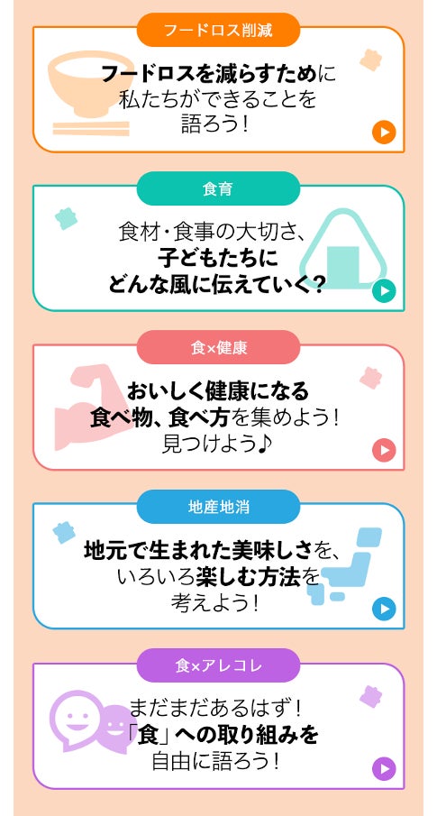 「食」を大テーマとして、「フードロス削減」「食育」「食×健康」「地産地消」「その他(食×アレコレ)」というテーマを設定。参加企業・自治体はこれら5項目のうち、「実際に取り組んでいる」「今後取り組んでいきたい」テーマを選択し、消費者とコミュニケーションすることができます。消費者は、参加企業・自治体が取り組む活動について知ることができ、また、「おいしく食べきる」ためのアイデアを発信、他の参加者と交流しながら自身の生活に活かすことが可能です。