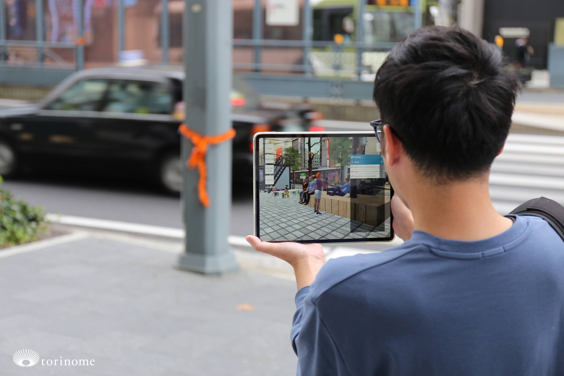 WSでは、 ホロラボの提供するXRデジタルツインプラットフォーム torinome (トライノーム)を活用します。Webアプリケーションとしてブラウザで動作するtorinome Webは、国土交通省が推進するProject PLATEAUで整備、提供される3D都市モデルを始めとして、その他にも多様な形式のGIS、画像、動画、3Dモデルを3Dの地球儀上に重畳表示ができるため、参加者はtorinomeを参照しながら議論を深め、その場で意見やアイディアを地図上に残していくことが可能になります。また、検討したアイディアは、torinome AR(iPadアプリ)を使って現実世界のその場所へ実物大サイズでAR表示しながら検証することができます。torinome Webの地図と現実の位置が自動でリンクするデジタルツインを実現しているため、現実世界での手動での位置合わせは不要です。