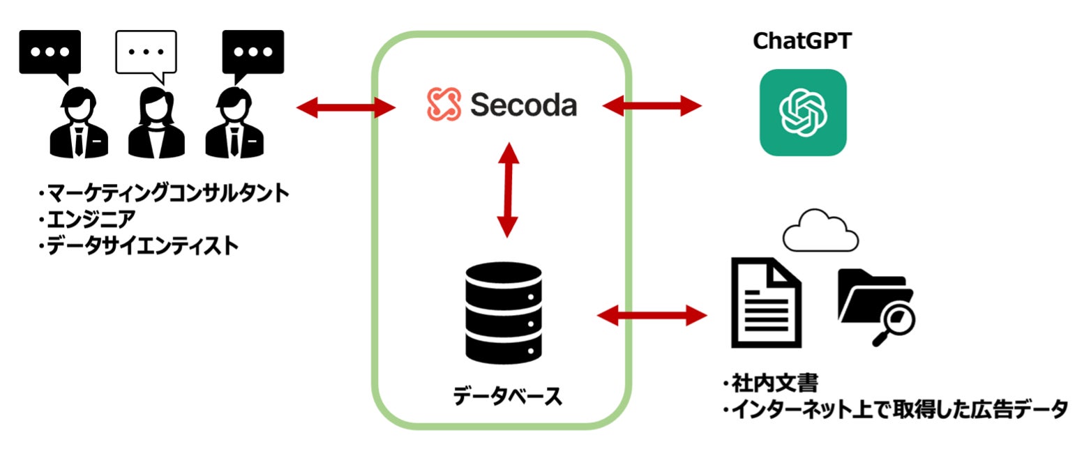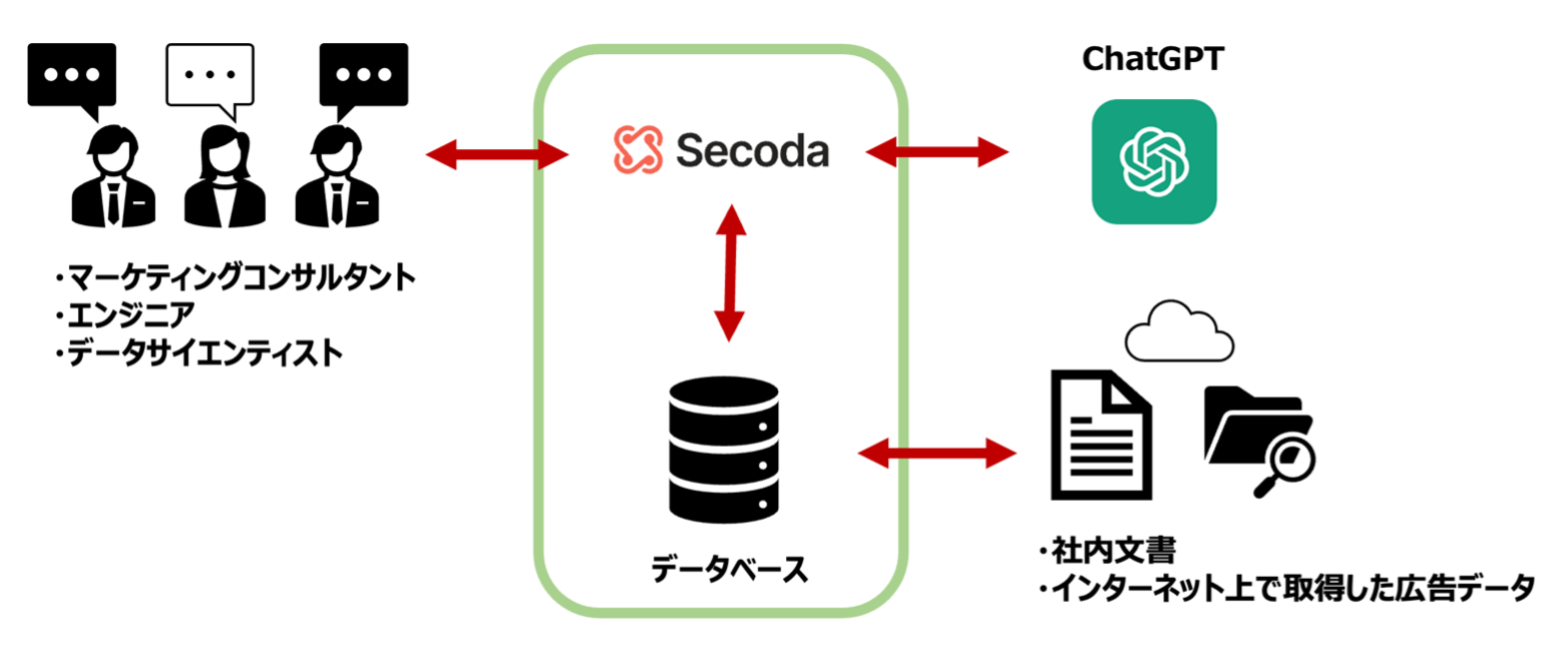 そこで、当社が独自に集約している社内データをSecoda※1で管理し、ChatGPT※2と組み合わせることで、従業員がデータの取り扱いに困った際、ChatGPTから迅速かつ的確に回答を得ることができます。