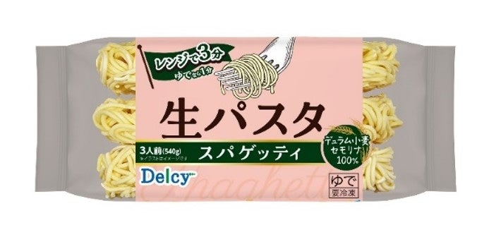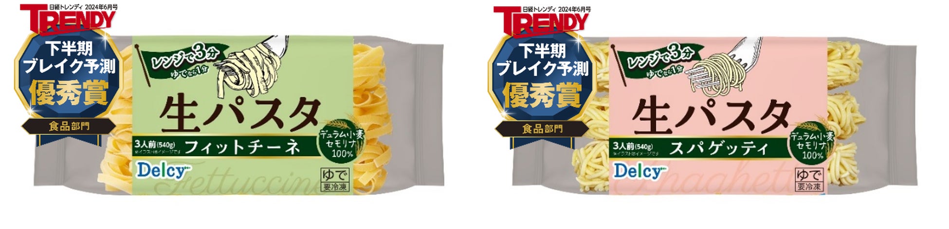 このたび、『下半期ブレイク予測 優秀賞』に認定された「生パスタ フィットチーネ/スパゲッティ」は、2024年3月1日に「Delcy」から新発売した、電子レンジで3分温めるだけでもちもち食感が楽しめる冷凍生パスタです。お湯の用意やゆで時間の長さ、火元の熱さなどに悩む必要はありません。料理の煩わしさを解消し、時間をかけず、気軽に調理いただけます。「日経トレンディ」2024年6月号では下半期注目に温度帯の壁を飛び越えた商品として、『冷凍うどんのような感覚で、食卓に定着しそうだ』と紹介。麺のみの冷凍パスタの定番化を期待・注目いただきました。