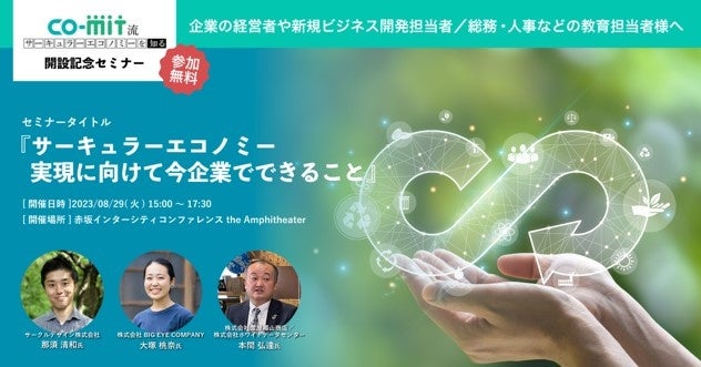 国内最大級の貸会議室検索サイト「会議室.COM」を運営するアスノシステム株式会社(東京都港区/代表取締役社長 齋藤 武育/以下、「アスノシステム」)は、自社で運営するホテルや宿泊施設で開催されるビジネスイベントにフォーカスした「MIT※」が行える施設検索サイト「CO-MIT(コミット)」内に、サーキュラーエコノミー(循環型経済)の最新情報や全国の先進事例、企業人材育成に役立つ越境学習・視察プログラムの情報を発信するコーナー「CO-MIT流サーキュラーエコノミーを知る」を開設します。本コーナーの開設を記念し価値ある企業合宿の普及を目的としたセミナー『サーキュラーエコノミー実現に向けて今企業でできること』を2023年8月29日15:00より開催いたします。