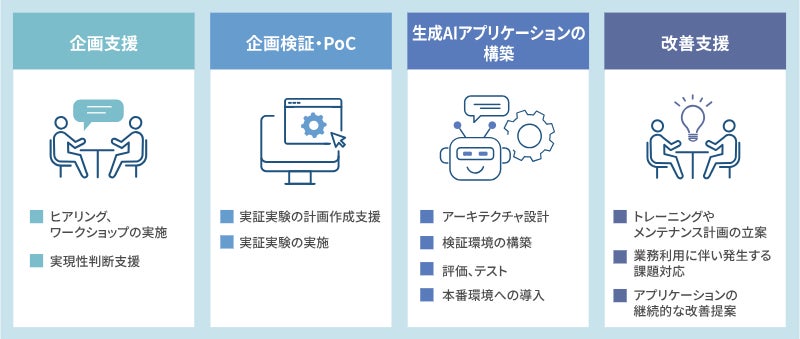 本サービスは、企業における生成AIの活用について、初期の企画支援から、企画検証、アプリケーション構築、改善支援までを一貫して支援し、お客様の技術的な課題や運用の不安を解消します。