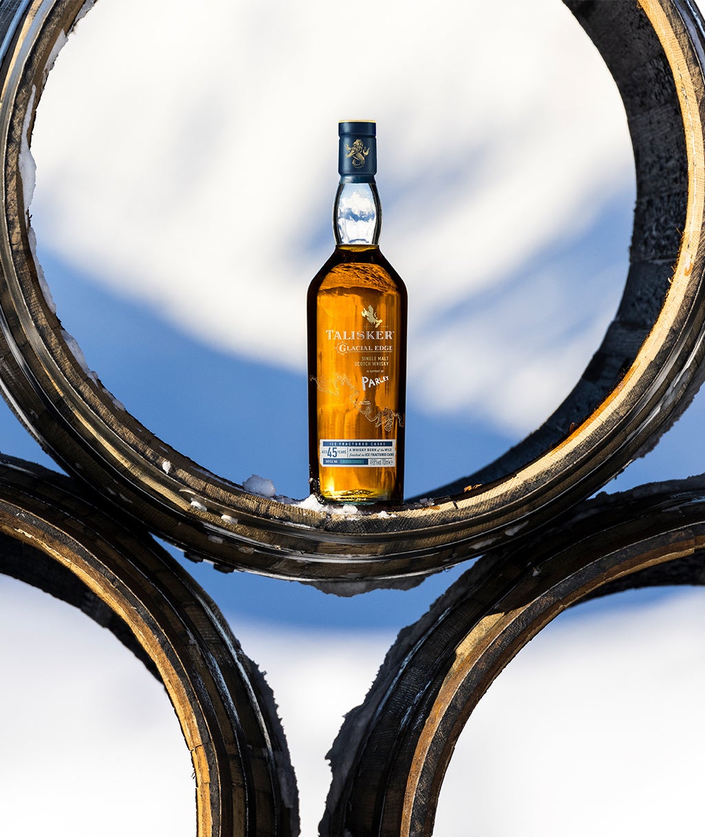 シリーズ最終章「タリスカー 45年」のテーマは氷河。タリスカーの海洋保護パートナーである「パーレイ・フォー・ジ・オーシャンズ」によるカナダ・ブリティッシュコロンビアの美しい氷河を取り戻す研究に同行し、12樽のヘビーチャー(樽の内側をしっかり焦がす)したアメリカンオーク再生樽を、-25℃を超える極めて過酷な氷河の中に 96時間保管しました。45年熟成のウイスキーをこの特別な樽でカスクフィニッシュすることで、極寒環境によってひび割れた樽の表面積が増え、甘くスパイシーな風味がよく表れています。