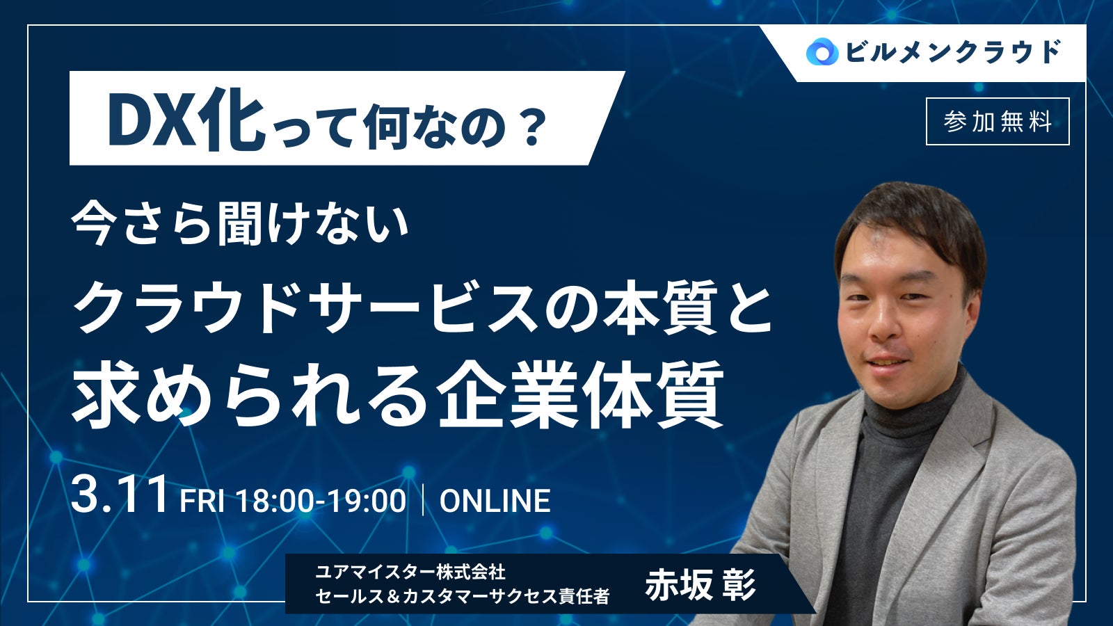 そこで、3月11日(金)に、複数のクラウドサービス開発ベンダーにてセールスマネージャーやDXコンサルタントとして活躍してきた「ビルメンクラウド」セールス&カスタマーサポート責任者の赤坂より、業務改善とDXの違いや、クラウドサービスの種類と特徴、 誰でも高水準で業務を行える環境設計、顧客や従業員と信頼関係を構築するためのデータ活用について講演します。