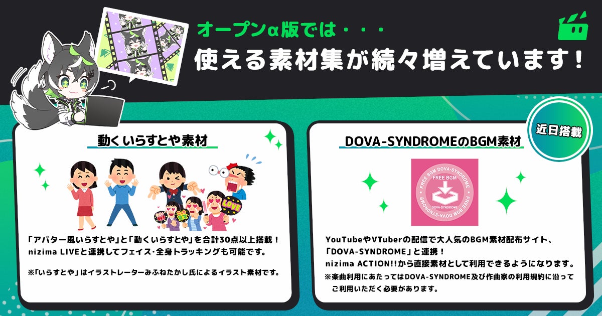 Live2D公式オンライン動画エディター「nizima ACTION!! 」が誰でも無料で利用可能なオープンα版をリリース!動くいらすとや素材も登場!