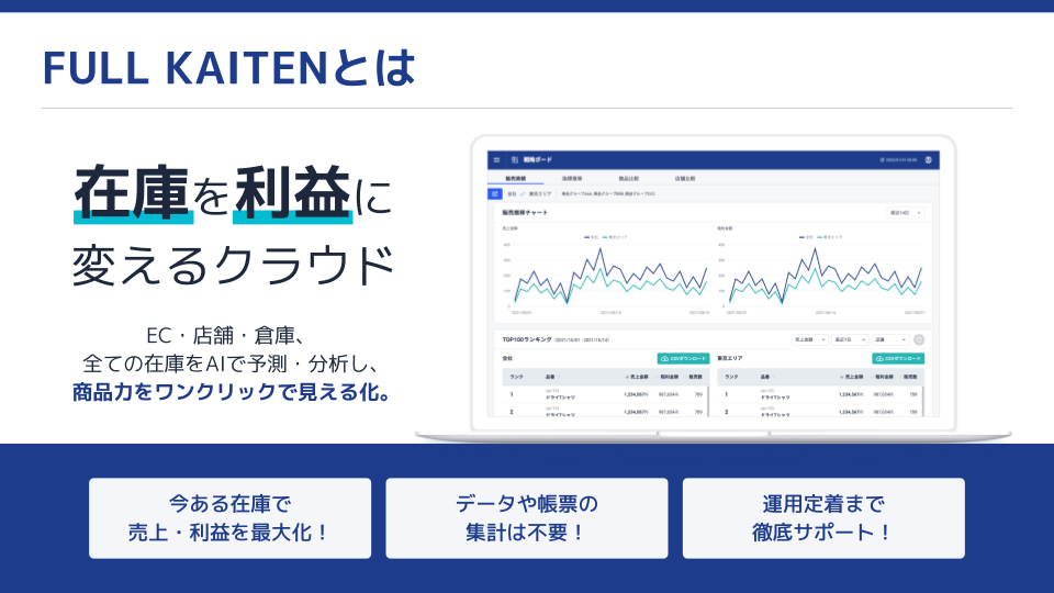しかし在庫効率の向上は、大量のデータを人力で集計・分析する労働集約型の業務フローでは実行が困難です。このため弊社はデータ集計・分析を自動化するツールとして『FULL KAITEN』を開発し小売企業に提供しています。