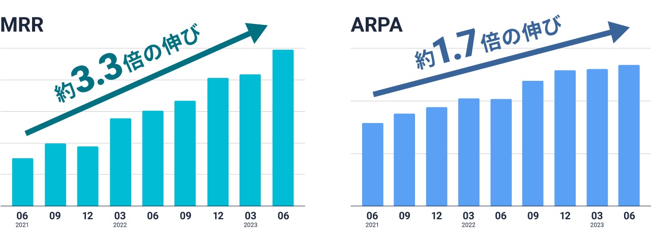 (2021年6月にジャフコ グループ株式会社より第三者割当増資で5億円を調達(2021年7月6日発表/https://prtimes.jp/main/html/rd/p/000000054.000025713.html)。MRRは2021年6月から2023年6月時点で約3.3倍の伸び。ARPAは2021年6月から2023年6月時点で約1.7倍の伸び)