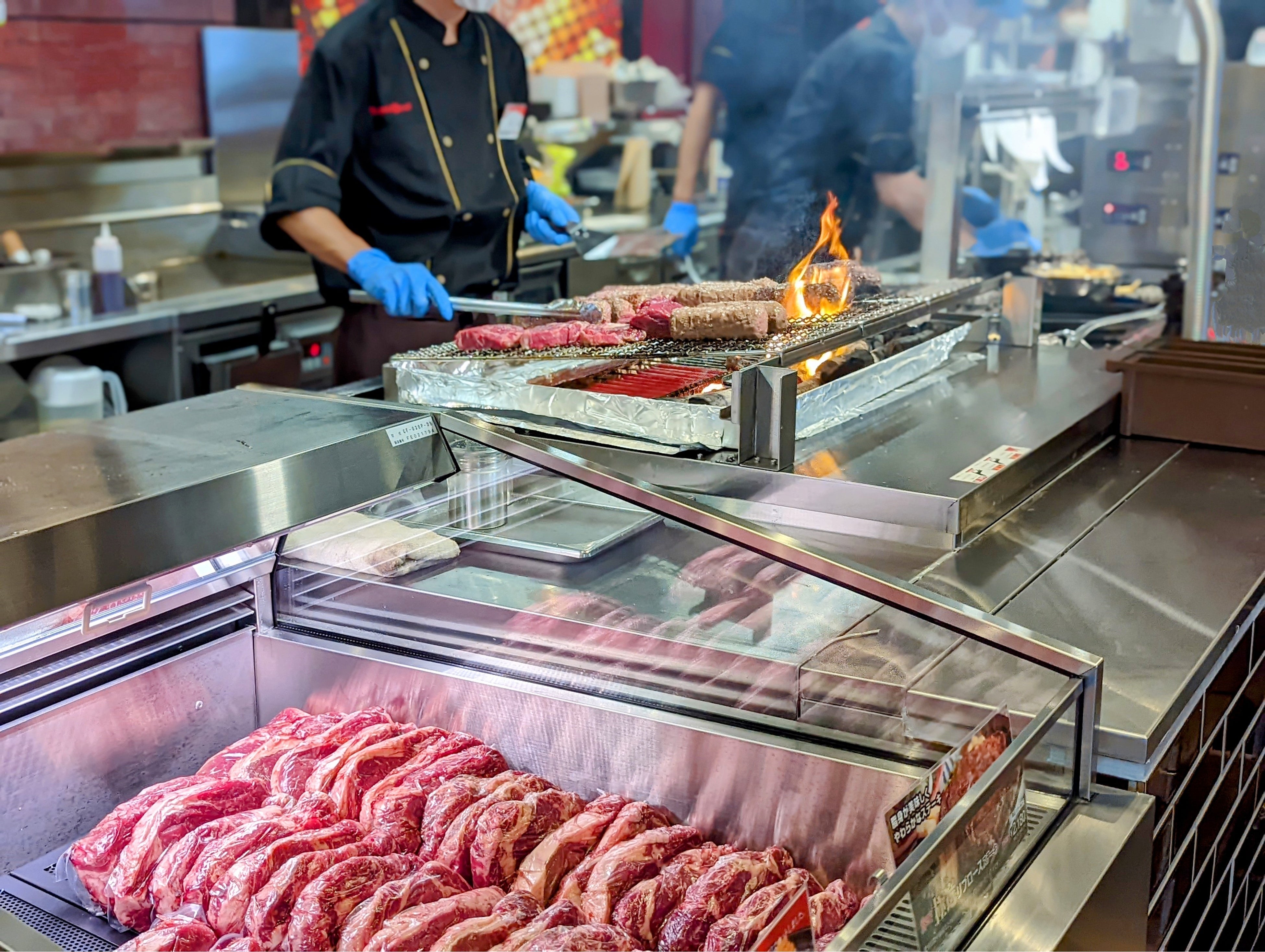 【こだわり1】全店オープンキッチン!ダイナミックに厚切りステーキやハンバーグを調理