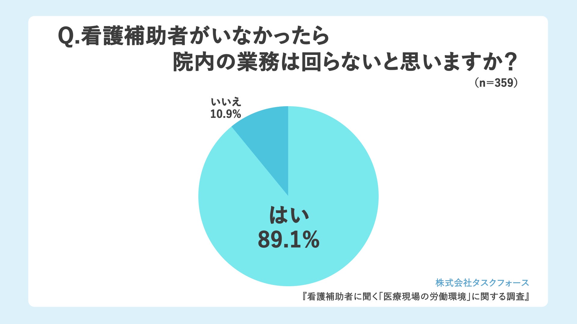 「看護補助者がいなかったら院内の業務は回らないと思いますか?」(n=359)と質問したところ、「はい」が320人(89.1%)、「いいえ」が39人(10.9%)でした。9割の看護補助者が、看護補助者なしでは院内業務は回らないと実感していることが分かりました。