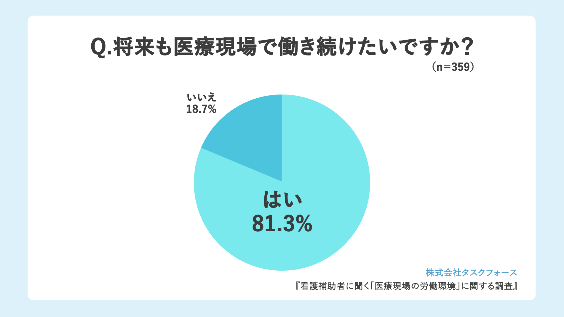 「将来も医療現場で働き続けたいですか?」(n=359)と質問したところ、「はい」が292人(81.3%)、「いいえ」が67人(18.7%)でした。医療現場を支え続ける意欲がある一方、将来への不安や負担感を抱える層の存在も示唆されています。