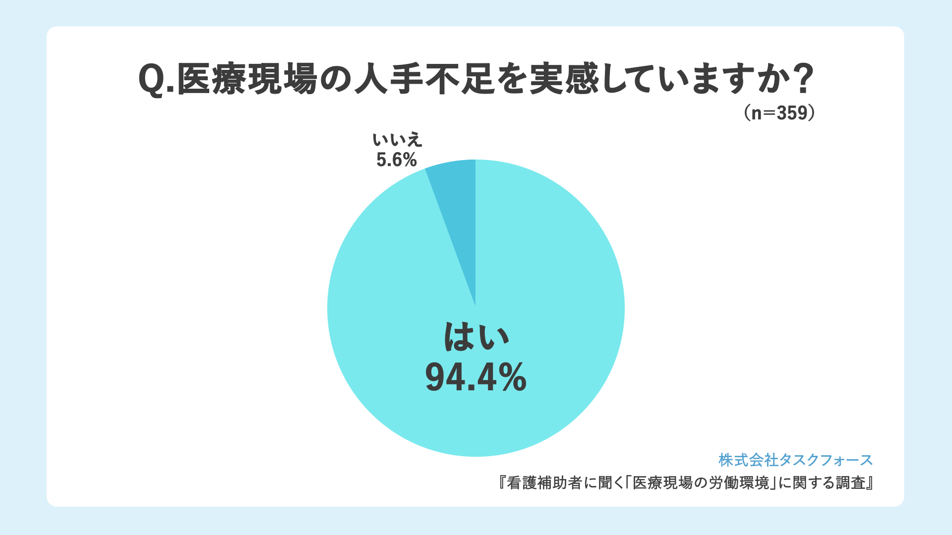 「医療現場の人手不足を実感していますか?」(n=359)と質問したところ、「はい」が339人(94.4%)、「いいえ」が20人(5.6%)でした。9割超の看護補助者が、医療現場の人手不足を実感していることが分かりました。