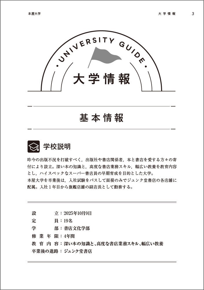 ハイスペックなスーパー書店員の早期育成を目的とした架空の大学「本屋大学」を目指す方のために「傾向と対策」「過去問と解答」「予想問題」「書店員の必読書」などを収録
