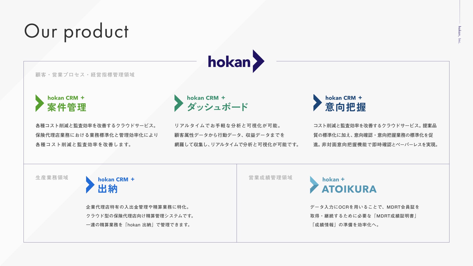 主に保険代理店を対象とする顧客・契約管理システムhokanは、見込みから保全までの情報を一元管理し、情報の集計/分析まで繋げることができる顧客・契約管理システムです。2018年のリリースから顧客を拡大し、2022年には全国の代理店・支店に導入を達成。使いやすさ・カスタマイズの柔軟性とサポート力・顧客の要望を聞きながらのプロダクトアップデート力を特徴とし、改正保険業法に伴い増加している事務処理を効率化します。企業代理店・生保・損保・乗合など、多様な代理店の皆さまにご利用いただいております。