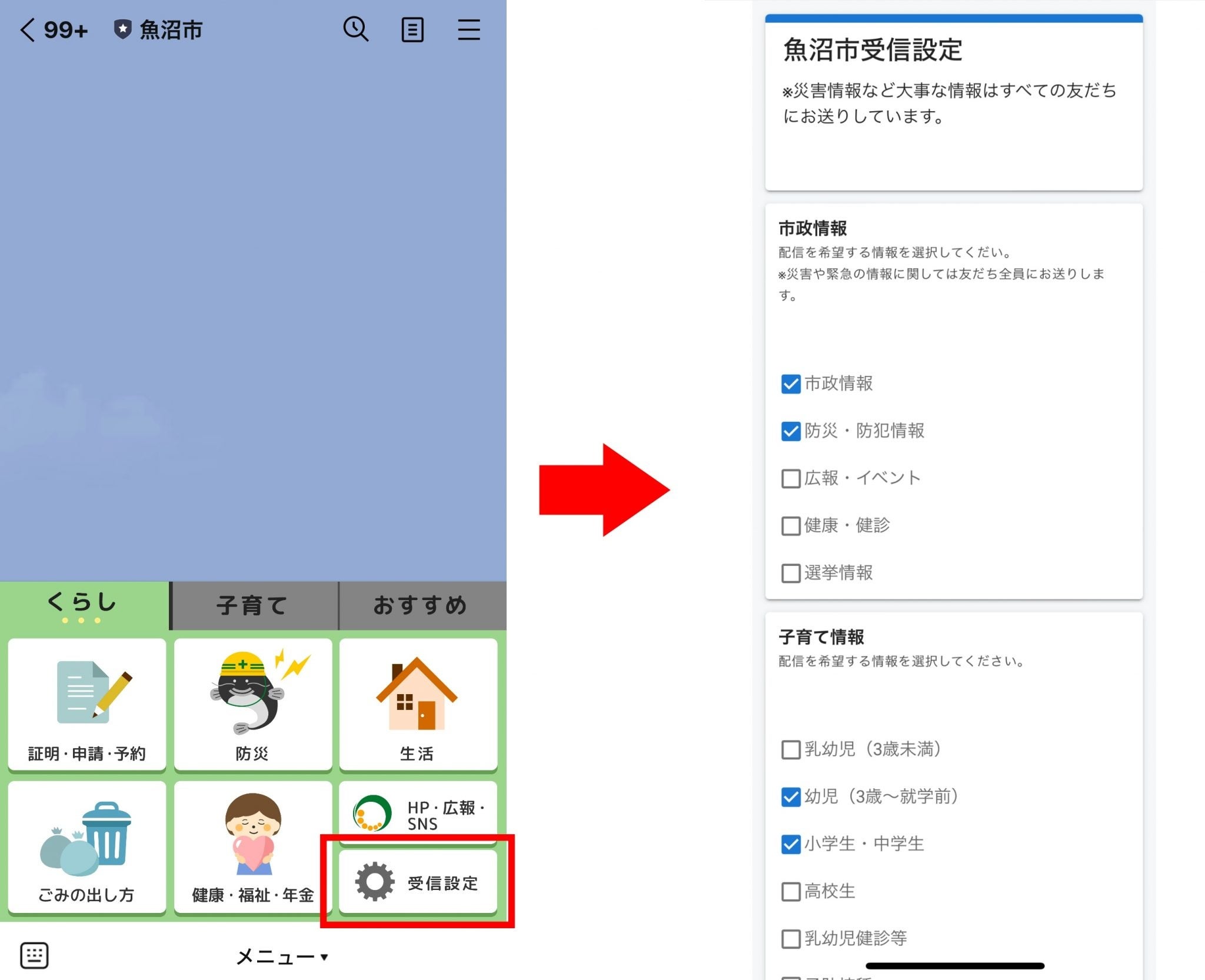 LINEに登録したユーザーは受信設定に回答することで、受け取る情報のカテゴリーをカスタマイズすることができます。市政情報や子育ての情報など必要な情報だけを受信することができるようになりました。