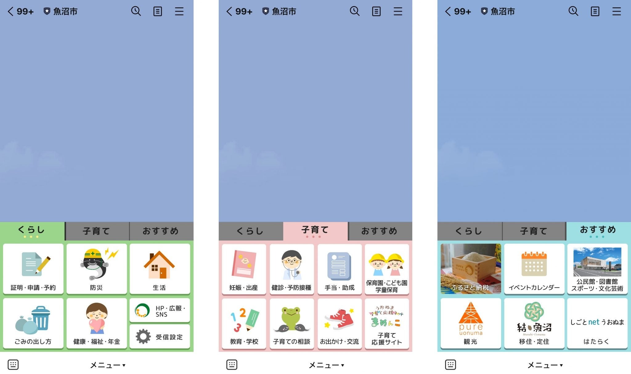 画面下部に表示されるメニューをタブ機能を使うことによち様々なジャンルの情報を提供することが可能となりました。「くらし」「子育て」「おすすめ」の3つのリッチメニューより、各種チャットボットを起動することができます。