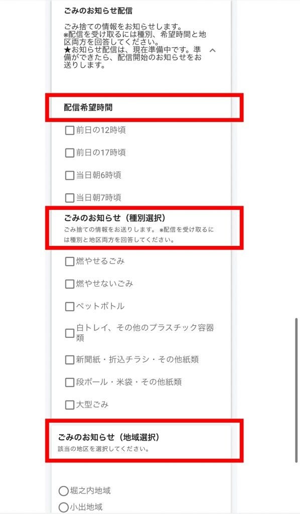 受信設定ではごみお知らせ配信を設定することが可能です。「配信希望時間」「種別」「地域」を選択することにより、ゴミ捨ての前日や当日にメッセージでお知らせ。ゴミの出し忘れ防止に役立ちます。※ごみのお知らせ配信は現在準備中