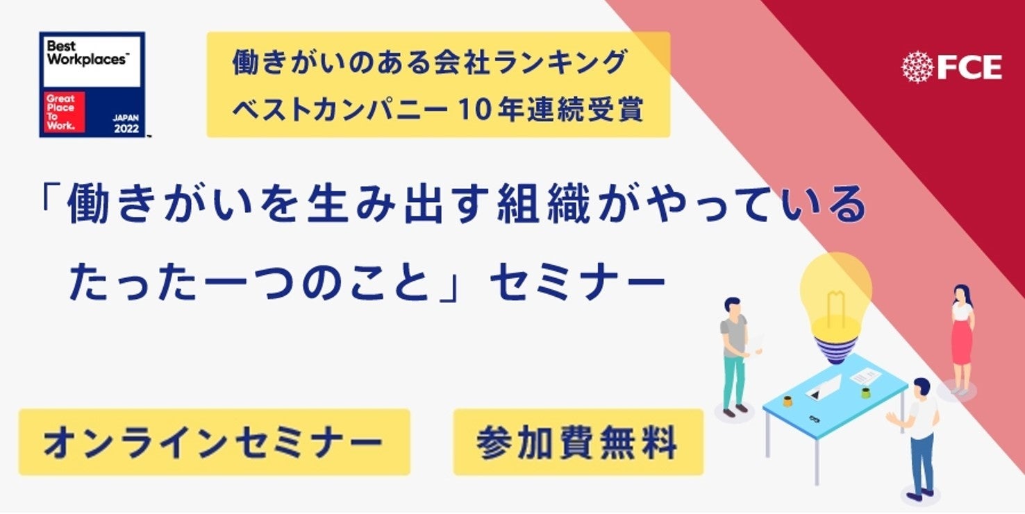本セミナーでは、「働きがい」を会社が「与える」のではなく、メンバーが「自分で生み出す」ことができる会社・組織になる秘訣を、FCEグループの実体験をもとに、余すことなくお伝えします。