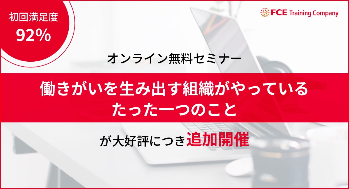 株式会社FCEトレーニング・カンパニー(本社:東京都新宿区/代表取締役:荻野純子)は、無料オンラインセミナー「働きがいを生み出す組織がやっているたった一つのこと」を追加開催することをお知らせします。本セミナーは2022年3月に開催をいたしましたが、参加者の皆様から大変ご好評をいただき、4月も追加開催が決定致しました。