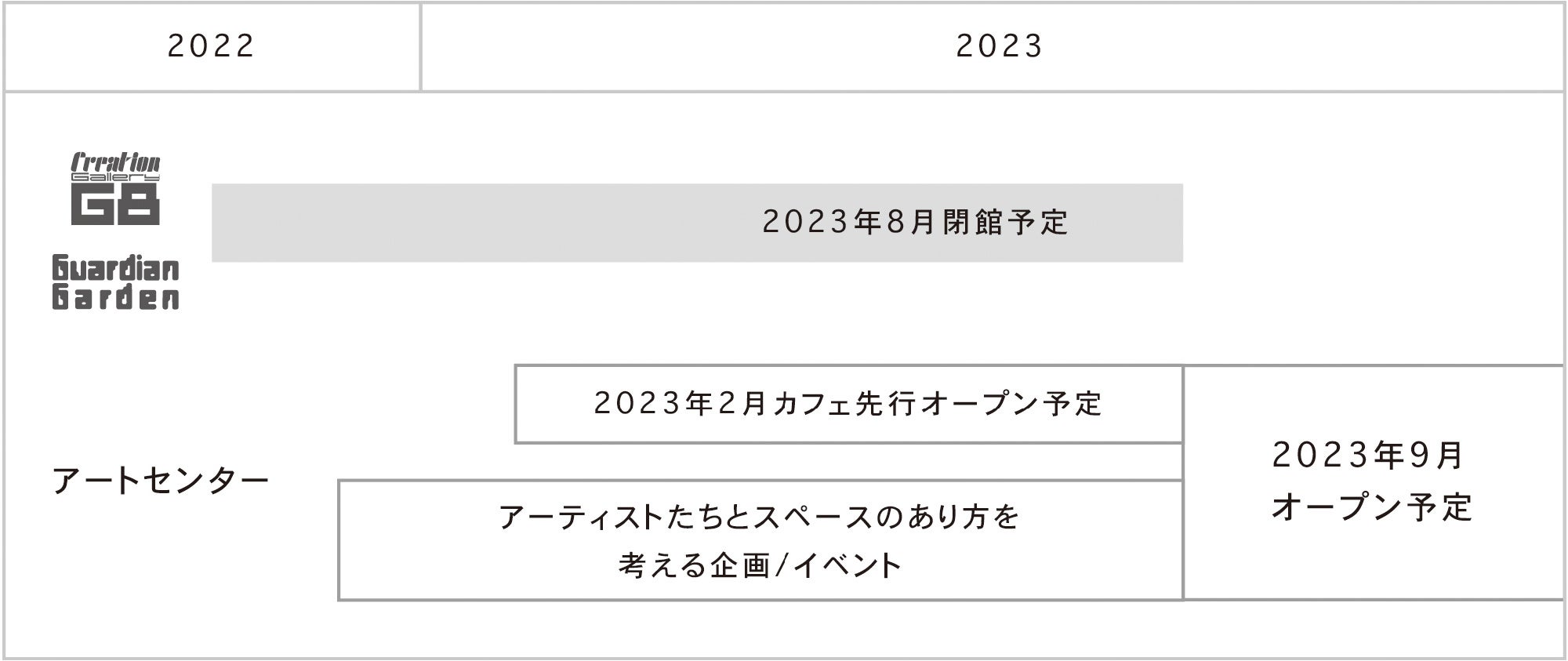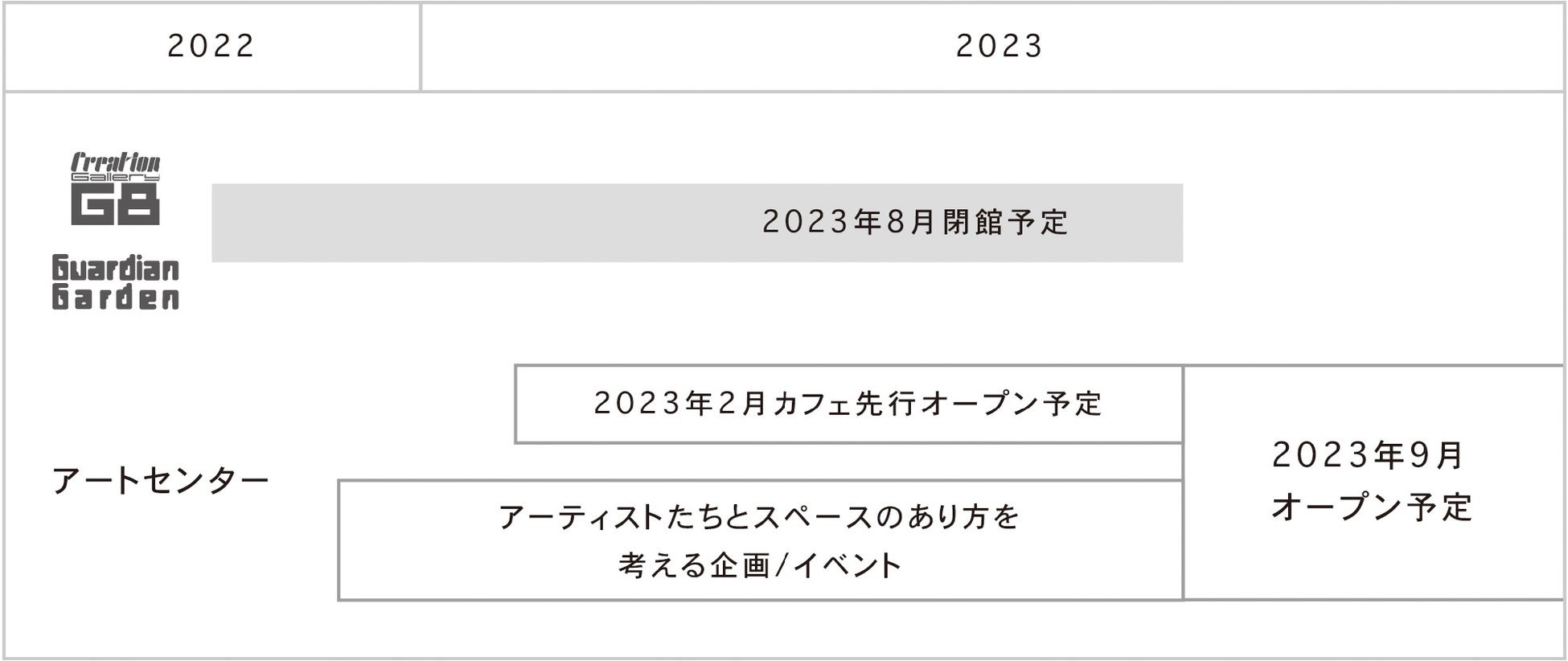 クリエイションギャラリーG8とガーディアン・ガーデンは2023年8月に活動終了。同年9月に新しくアートセンターがオープンします
