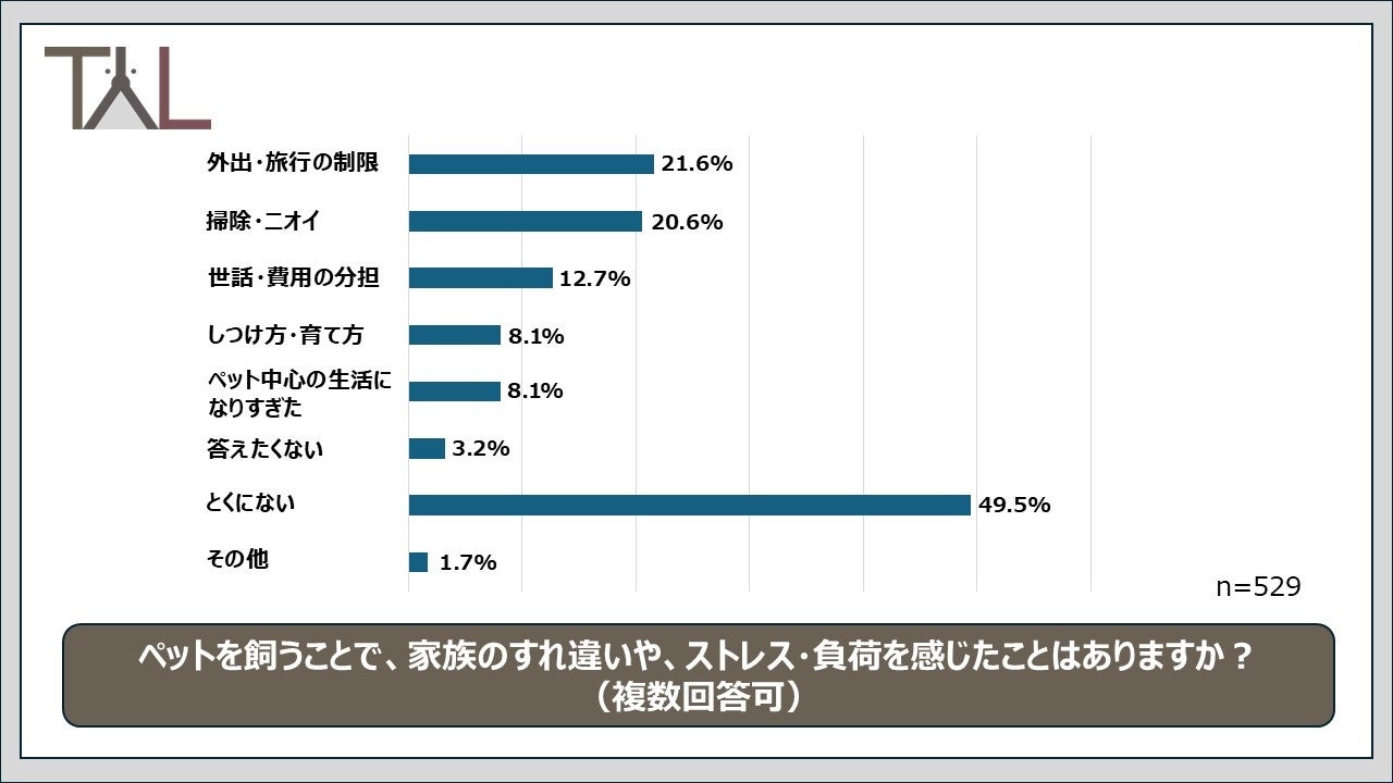 一方で「ペットを飼うことで家族のすれ違いや、ストレス・負荷を感じたことはありますか?」という質問には、約半数が「とくにない」と回答しました。負担に感じた内容としてもっとも多かったのは「外出・旅行の制限(21.6%)」で、その他の項目は大きくは伸びておらず、ストレスや負担を強く感じている飼い主は多くないことが分かります。こうした結果から、ペットはライフスタイルや価値観を大きく揺るがす存在というより、夫婦・パートナー・家族の中に「自然にいるもの」として受け入れられていると推測できます。