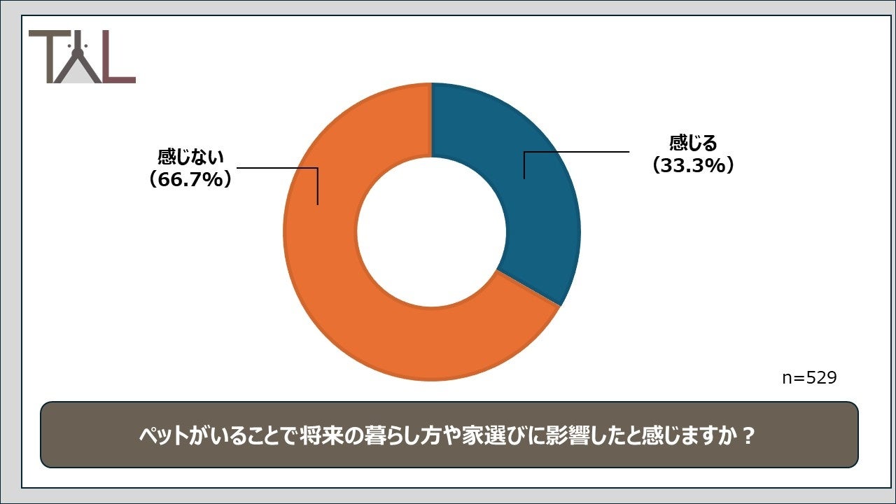 ペットの飼い主529名に「ペットを通じて、パートナー・家族に対する見方や価値観が変わったと感じますか?」と質問したところ、67.5%の飼い主が「変わらない」と回答しました。コミュニケーション量の変化について尋ねた質問でも「大きく増えた」「増えた」と回答した飼い主はあわせて40%弱にとどまりました。また、「ペットがいることで将来の暮らし方や家選びに影響したと感じますか?」という質問に対しても「感じる」と回答した飼い主は33.3%にとどまり、ペットの存在が生活設計に大きく影響している人は一部に限られる結果となりました。