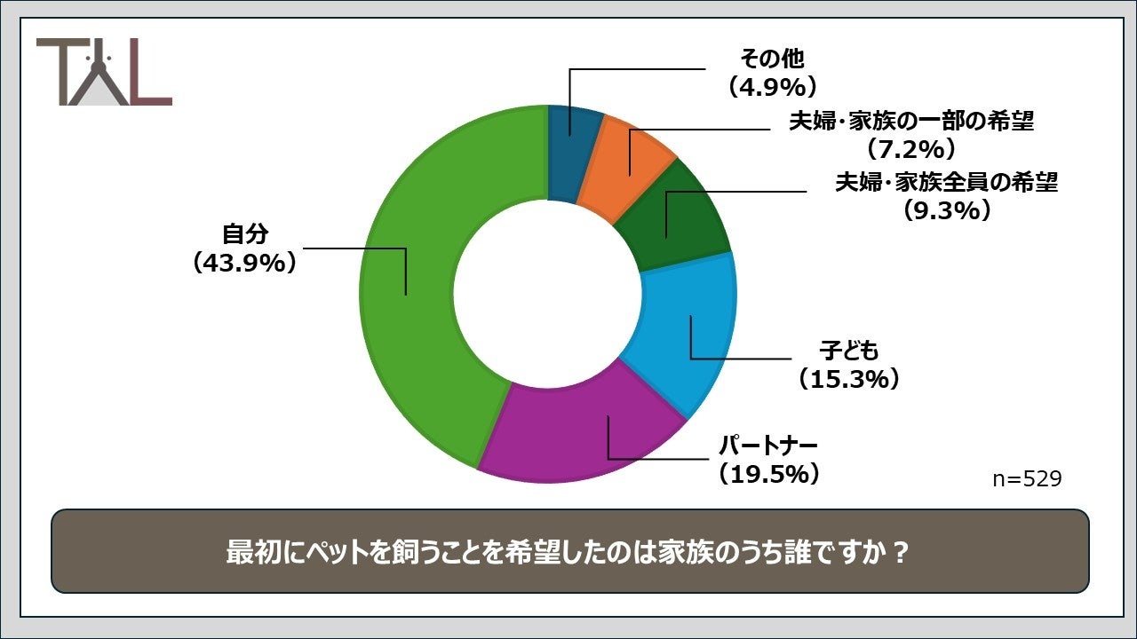 ペットの飼い主529名に「最初にペットを飼い始めたのはいつですか?」と質問したところ49.3%が「結婚・同居前から飼っていた」と回答しました。また、「最初にペットを飼うことを希望したのは家族のうち誰ですか?」という質問に対しては、43.9%が「自分」と回答しました。「同居する両親の希望(50代・女性)」「実家で暮らしていたころ、姉が飼い始めた(70代・男性)」という回答もありましたが、飼い主の多くが自身の意向でペットを迎えていることが分かります。