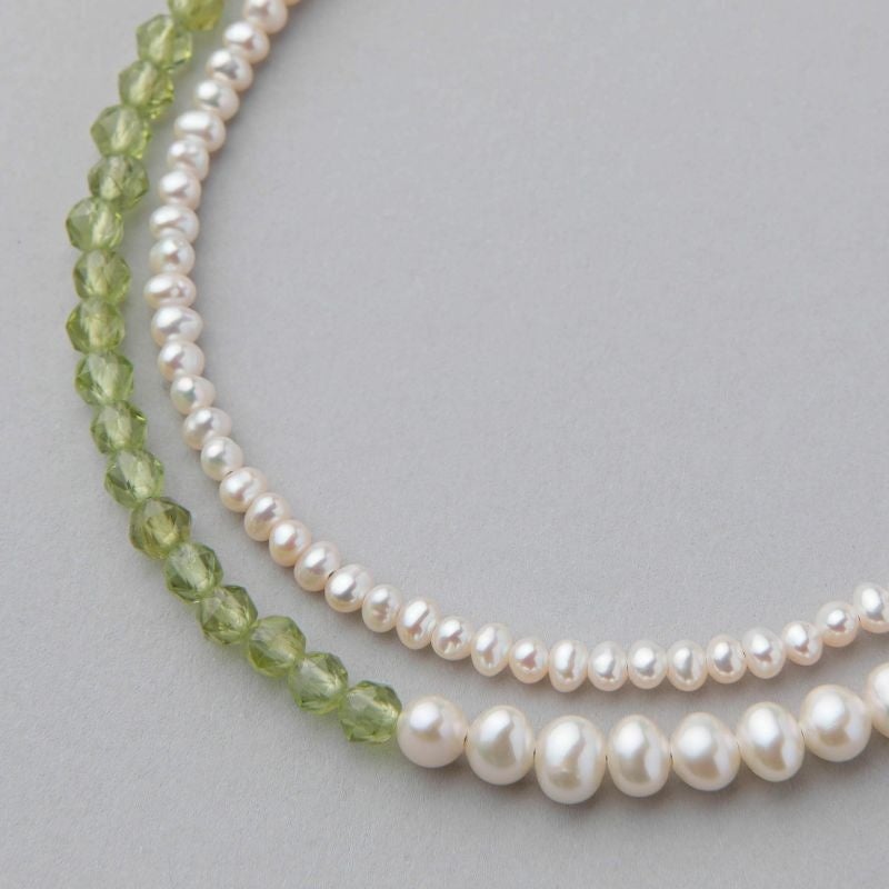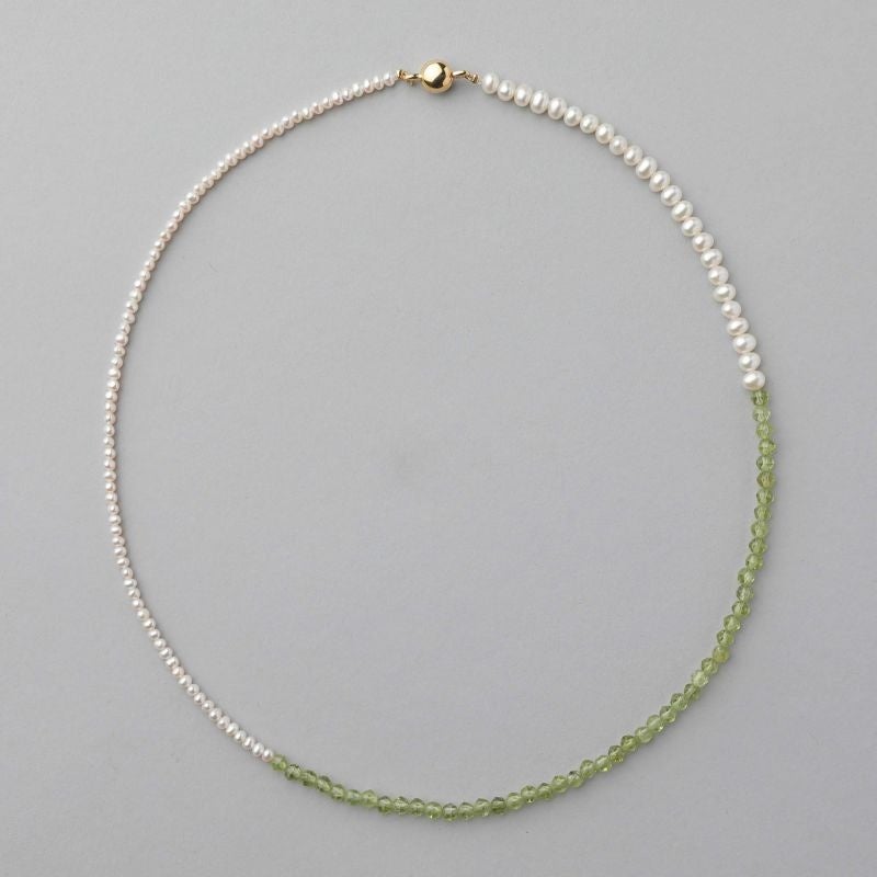 2~4mm台の2種の細さのベビーパールとペリドットをミックスしたデザインネックレス。