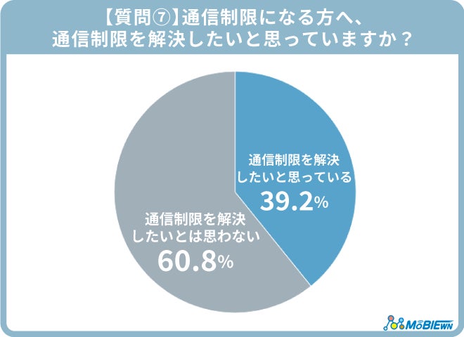 「通信制限になる方へ、通信制限を解決したいと思っていますか?」という質問では、半数以上の60.8%が「通信制限を解決したいとは思わない」と回答しています。