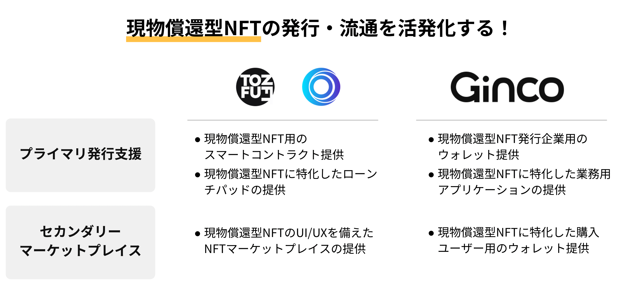 そこで、多様なNFTを売買するマーケットプレイス「tofuNFT」を運営し、かつ世界最大規模のNFTマーケットプレイス「X2Y2」と戦略的提携を行っている株式会社COINJINJAと協議を重ね、①現物償還型NFT事業立ち上げ支援 ②現物償還型NFTのセカンダリマーケットプレイス提供 この2つのサービス提供に向け協業を開始する運びとなりました。