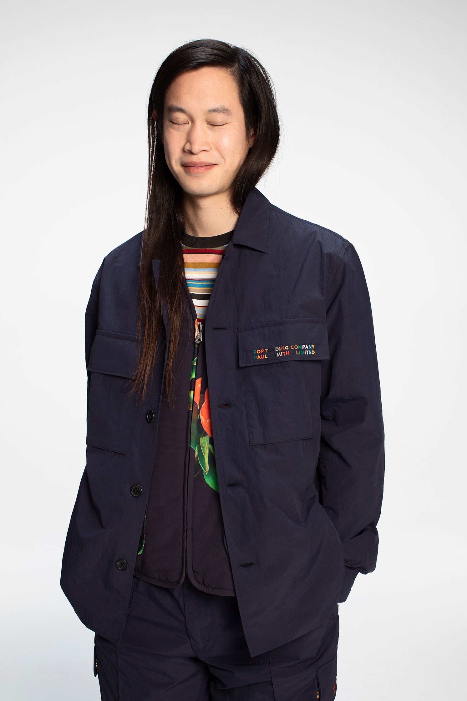 「このコレクションで本当にエキサイティングだったのは、Pop Trading Companyのピーターとリックが新鮮な目でポール・スミスのアーカイブを眺め、過去のデザインをルーツにしつつも、完全に現代的なコレクションを作るに十分なインスピレーションを得てくれたことです。カラー、ストライプ、テーラリングといったポール・スミスの代名詞と、Pop Trading Companyのリラックスしたシルエットとが、シームレスに融合しています。」