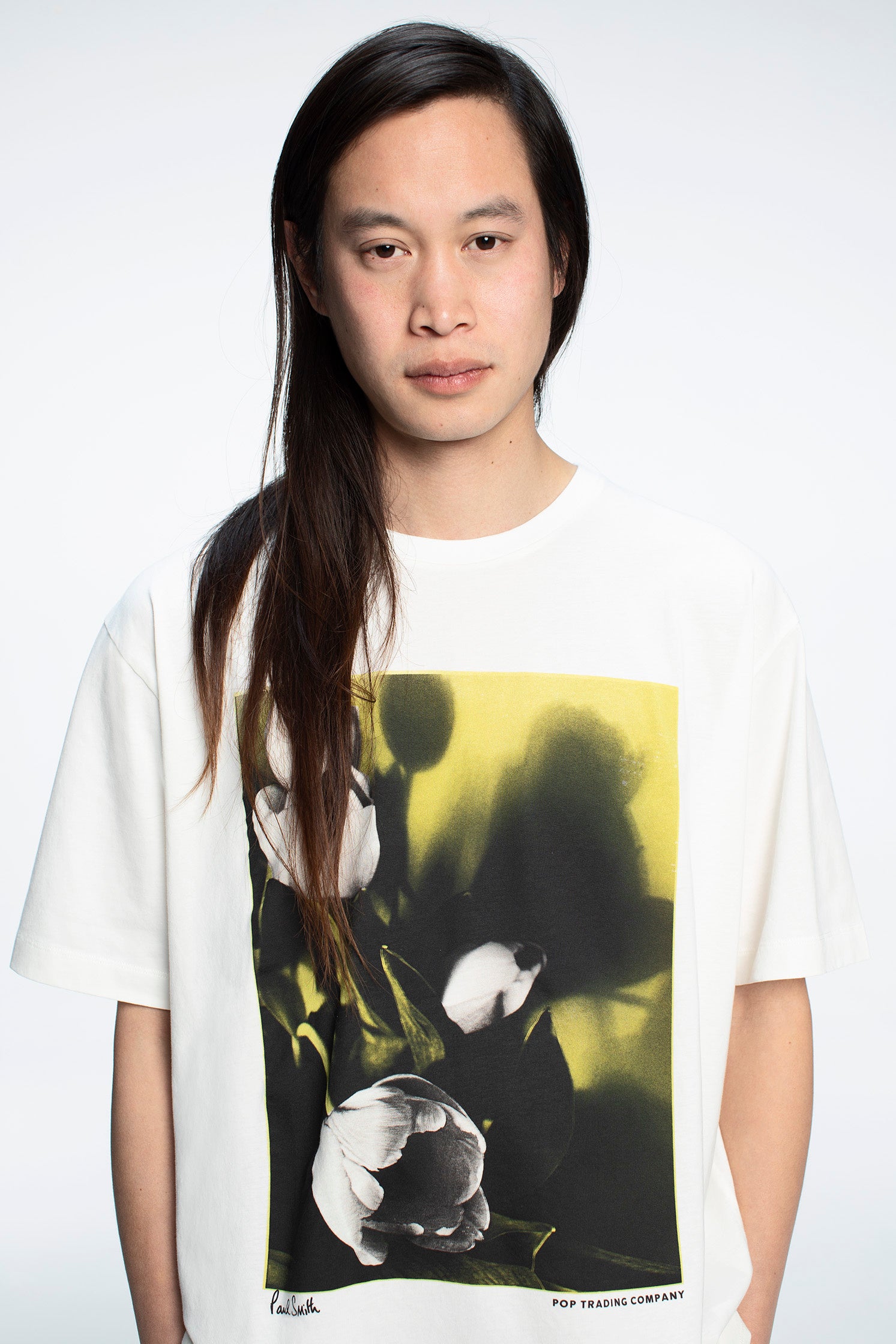 コレクションのキープリントであり、意外なアクセントを加えているチューリッププリントは、ワークウェアやポール・スミスのアーカイブからインスパイアされたユーティリティベストとトラウザーズにあしらわれています。この大胆なチューリップのグラフィックパターンは、90年代のショーの招待状に使用されたフォトグラフィックプリントの一つを再構築したものです。チューリップはポールが好きな花であり、Pop Trading Companyの拠点であるオランドのルーツ、そしてポール・スミスのブランドの歴史を象徴しています。