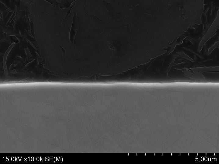 これらの課題を解決するため、「HPM-L111」では、田中貴金属が長年の貴金属素材研究開発で培った独自の表面処理技術を採用しています。膜表面に微細な凹凸構造を形成し、比表面積を拡大することで、水素の侵入速度を高め、100℃以下の低温領域における水素透過性能の大幅な向上を実現しました。