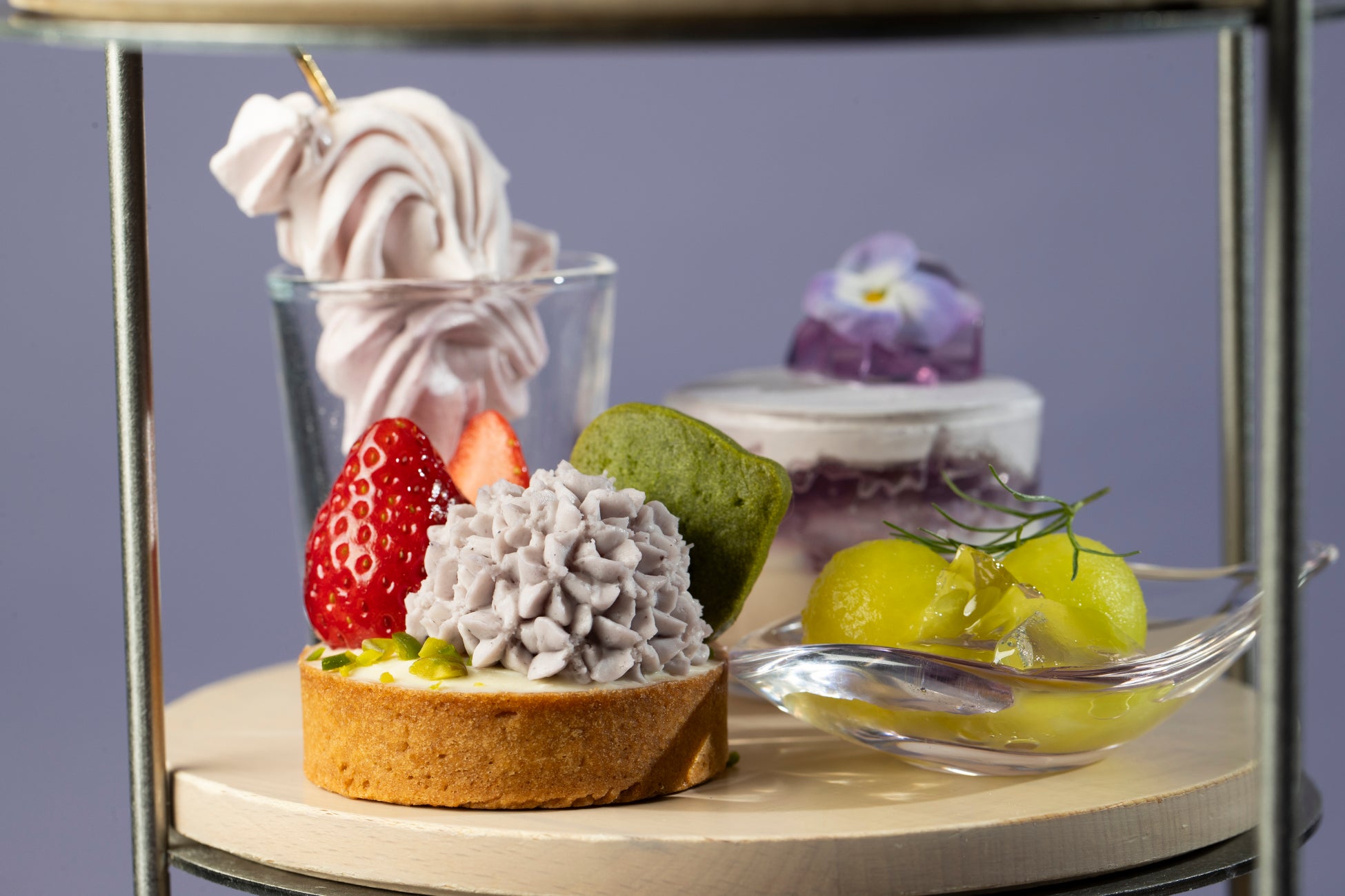 1~4段目 いちごのレアチーズパフェ/マスクメロンのマリネ/カシスのマカロン/紅芋のスコーン/パープルフラワーのメレンゲ/桃とラベンダーのクリスタルムース/ホワイトチョコレートトリュフ/ベリーのライラックモンブラン
