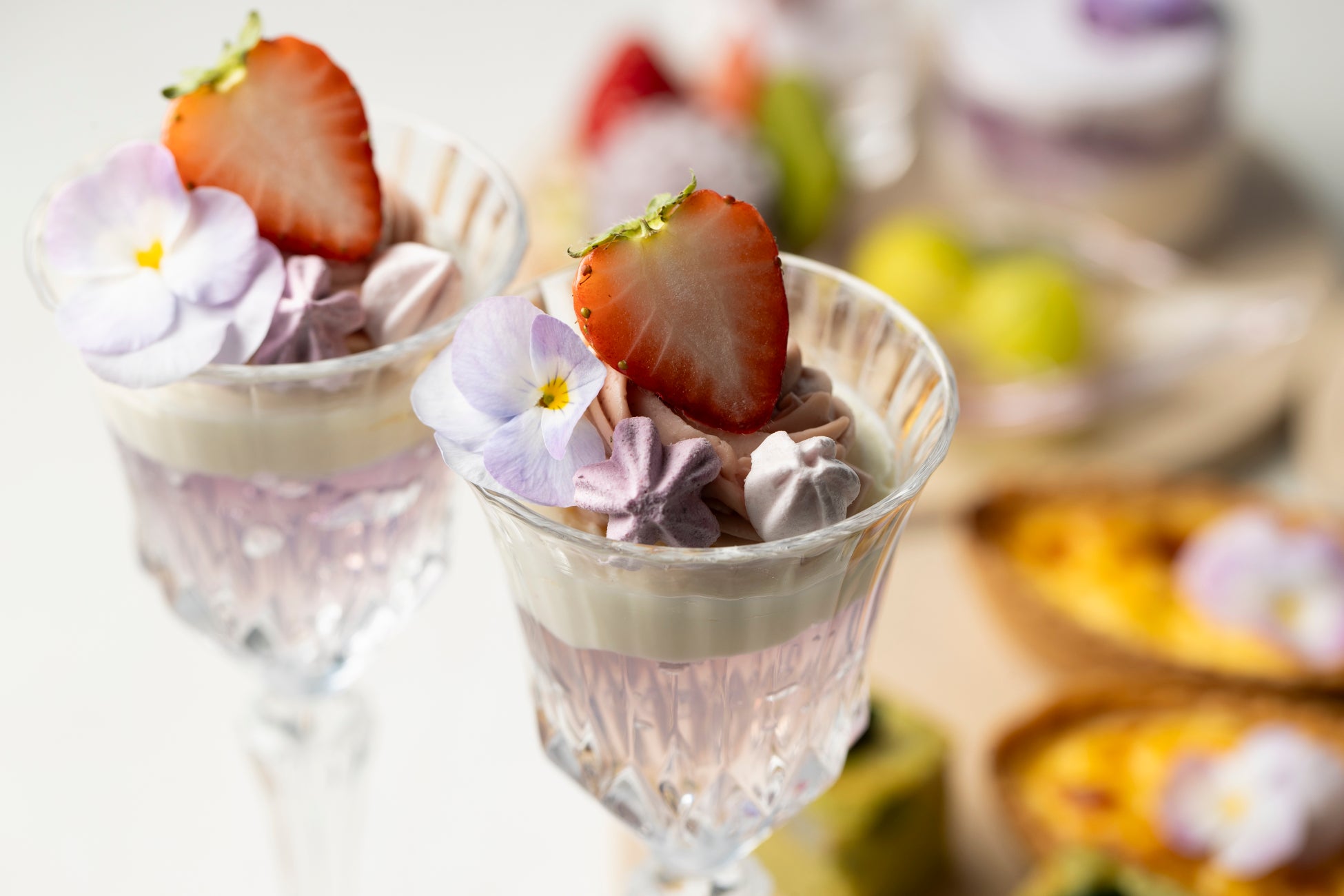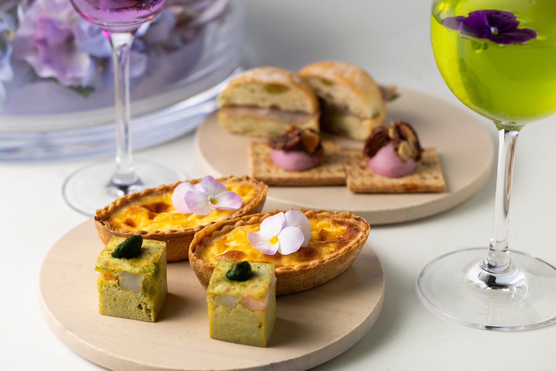 セイボリーは、人気の「キッシュロレーヌ」や「枝豆フォカッチャの生ハムサンド」など、季節を感じるフレンチシェフならではの4種類がラインナップ。ドリンク(ノンアルコール)には、新緑が彩る小道をイメージしたハーブティーと日本茶香る「エバーグリーン」、鮮やかな初夏の花々に自家製フラワーハーブシロップが爽やかな味わいの「バイオレットフィズ」をお楽しみください。