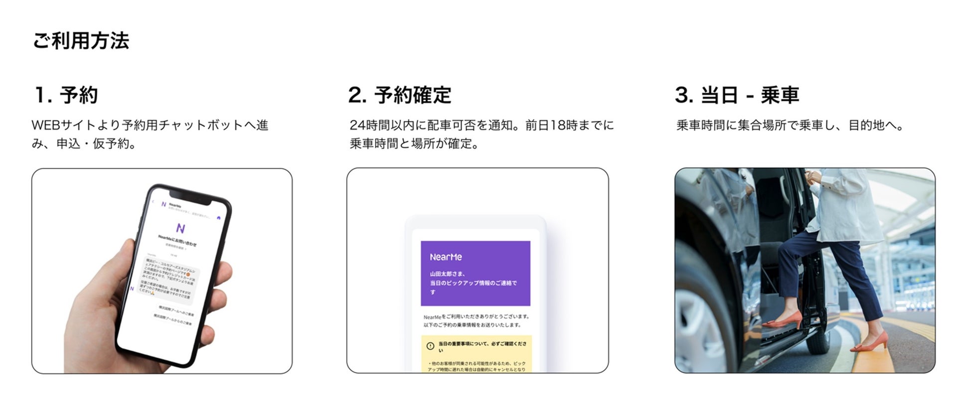 「NearMe」は、独自のAIを活用した最適なルーティングで、出発地から目的地までの移動をドアツードアで結ぶタクシーのシェアサービスです。その中でも、空港とその周辺の都市部を結ぶ空港送迎型のエアポートシャトルサービスは、2019年8月のサービス開始よりこれまで延べ50万以上の方々にご利用いただいています。 現在は、全国15の空港※1(成田国際・中部国際(セントレア)・関西国際・大阪国際(伊丹)・東京国際(羽田)・新千歳・福岡・北九州・那覇・旭川・帯広・青森・仙台・南紀白浜・徳島)と、空港周辺の都市部でご利用いただくことができます。対象エリアであれば、出発地となるご自宅から空港、そして空港から最終目的地まで一気通貫でつながるため、公共交通機関の乗り換えがなくなるなど、ストレスフリーな移動体験を提供することができます。また、貸切送迎サービスや、東京都と千葉県全域のゴルフ場と東京都23区内を結ぶゴルフ場送迎シャトルなど、シチュエーションに応じて様々な移動のニーズに対応するための各種サービスを展開しています。