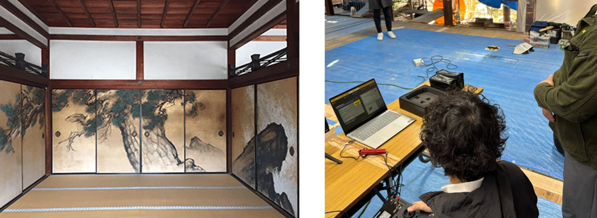 そこで、実際に仁和寺白書院の修繕を担当する宮大工の立ち会いのもと、IBIS2による点検を実施し、歴史的建造物に関するドローン点検の有効性について検証いたしました。