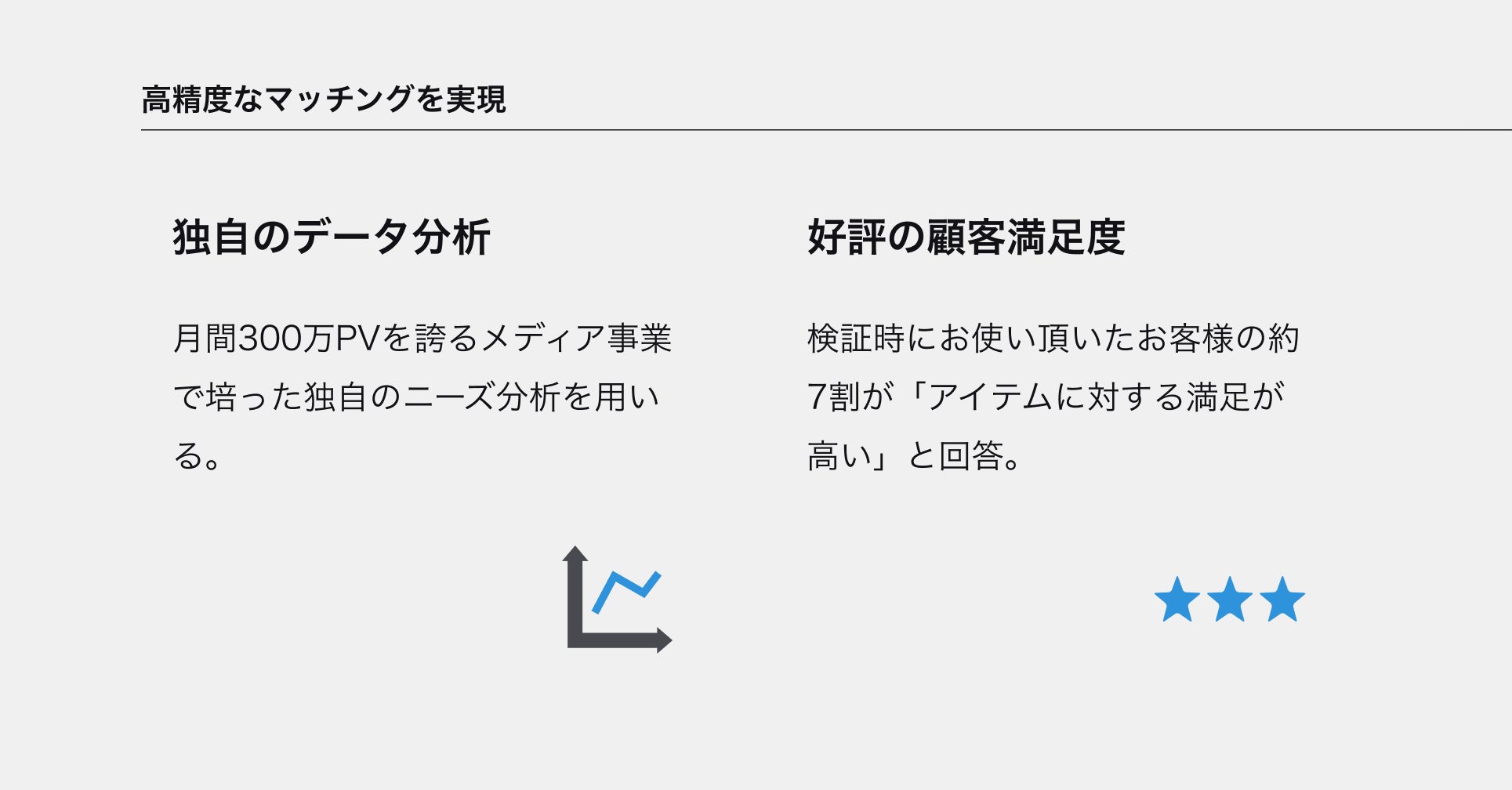 月間300万PVを誇るメディア事業で培った独自のニーズ分析を用いて、お客様と製品の高精度なマッチングを実現します。KENCOCOを検証時にお使いいただいたお客様の約7割から「アイテムに対する満足が高い」と回答いただきました。