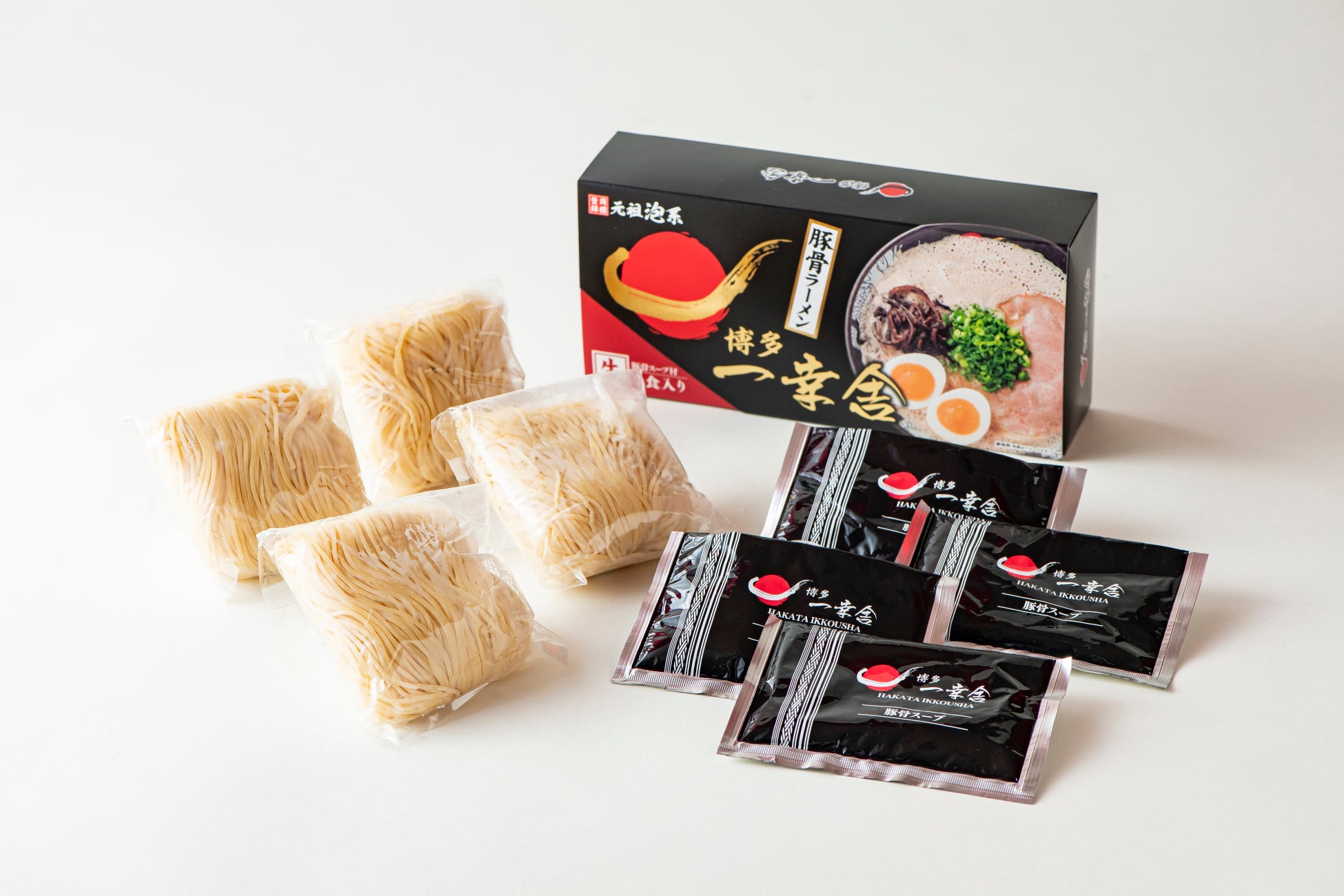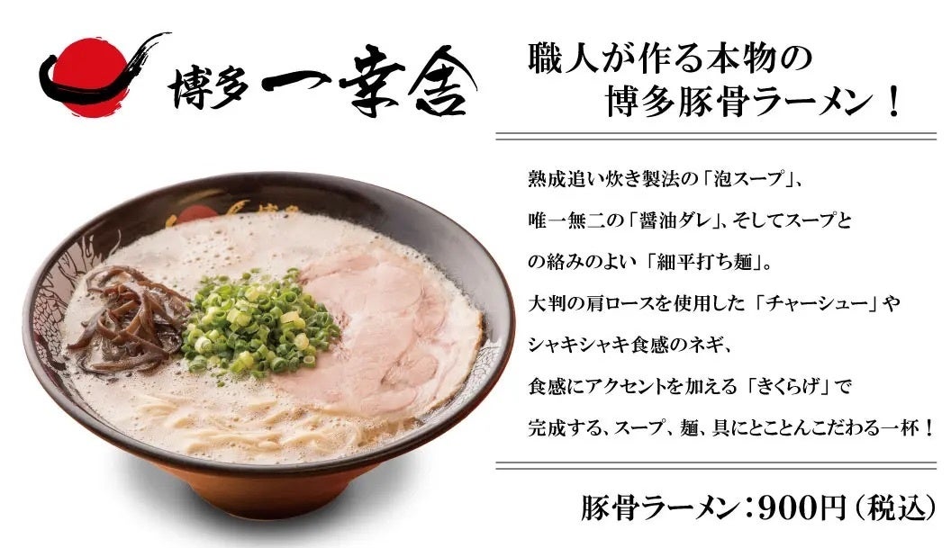 博多⼀幸舎は2004年に福岡県福岡市中央区大名で開業し、創業者の吉村幸助が『どこにもない、どこにも属さない、本物の豚骨ラーメンを追及したい』という想いから試⾏錯誤の末に誕⽣しました。そのこだわりは唯一無二の「醤油ダレ」と「豚骨スープ」、スープとの相性を突き詰め生み出された「製麺屋慶史の特注麺」です。ラーメンの味の決め手となるカエシ(醤油ダレ)は数種の地醤油、魚介の要素をブレンドした門外不出の醤油ダレです。そして豚骨スープは、豚の頭骨、背骨、丸骨を砕けるまでとことん炊き込み、「若いスープ」と「熟したスープ」を継ぎ足しながら作る「熟成追い炊き製法」で作りだされます。この技で旨みを凝縮させていくと、独特なクリーミーさと、きめ細やかな「泡」が生まれます。スープの表面に浮かぶ「泡」は旨みの証で、博多一幸舎のラーメンの最大の特徴です。そして麺は、泡立つクリーミーな豚骨スープに合うよう、博多一幸舎の為だけに特別配合したこだわりの⼩⻨粉を使用。小⻨本来の香りを残しモッチリとした食感が出るように仕上げた「細平打ち麺」です。ラーメンにトッピングする大判チャーシューは脂と肉のバランスがよい豚肩ロース、色味を加えるネギ、食感のアクセントが楽しいきくらげが盛りつけられた、見た目も美しい「博多豚骨ラーメン」です。創業の翌年には京都府に出店し、この出店を機に国内のみならず海外展開が加速し、現在ではアメリカ、中国、オーストラリア等で高い評価を得て、世界10カ国60店舗以上で楽しんでいただけるグローバルブランドとして成長しています。