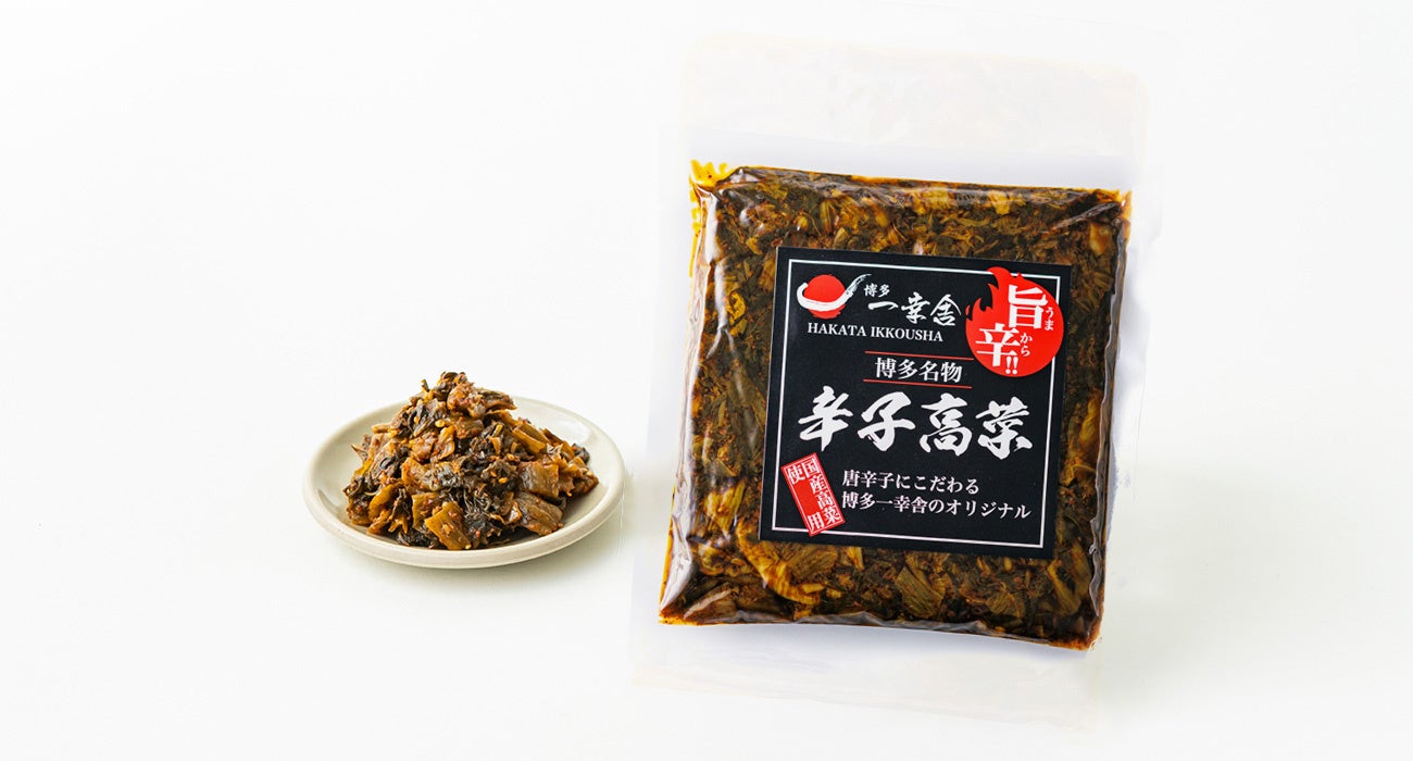 唐辛子をふんだんに使用し、食べるたびに唸る辛さを味わえる「博多一幸舎」の店舗でしか味わえない「辛子高菜」をお土産に。