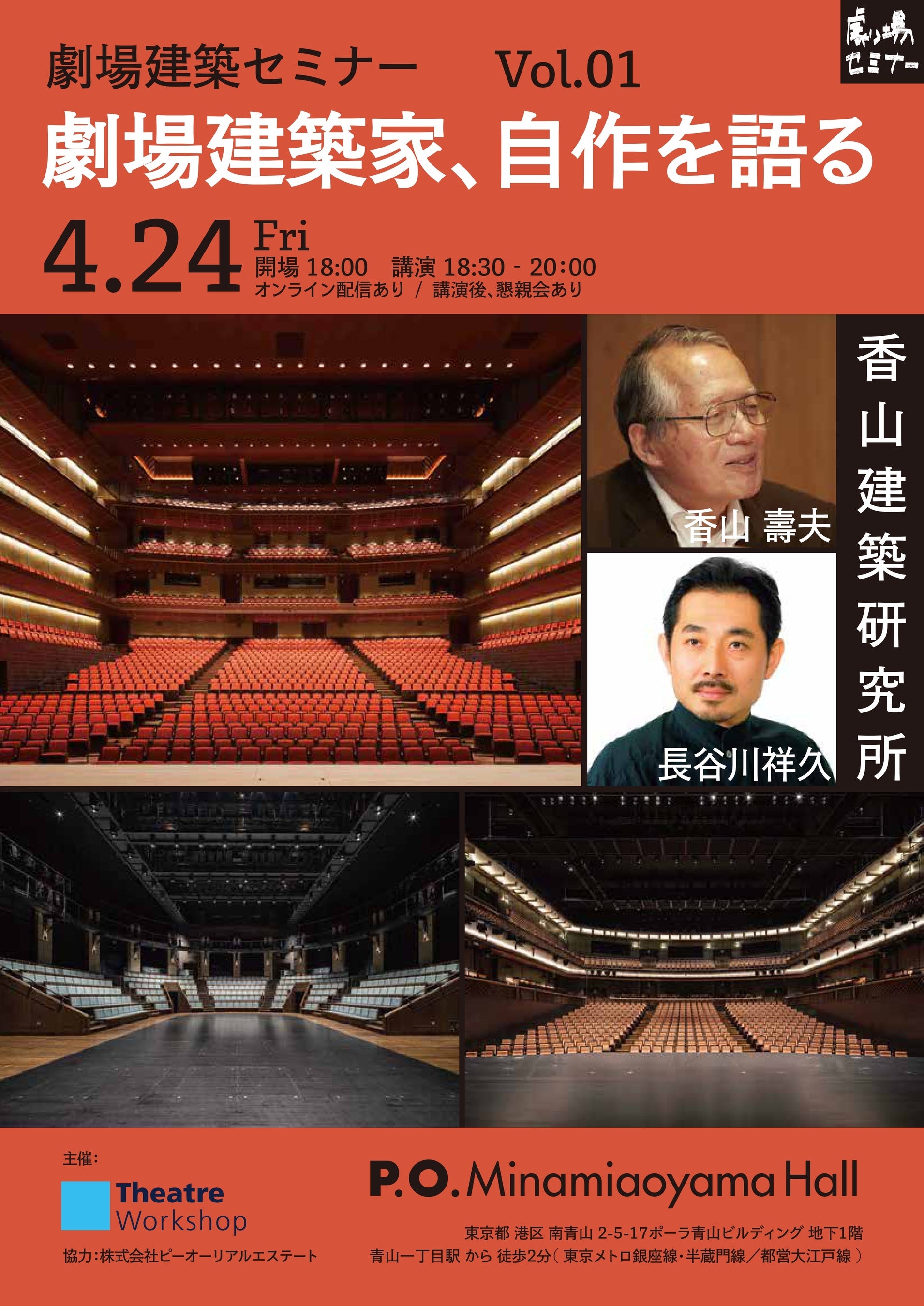 劇場の未来を考えるセミナーの新シリーズ『劇場建築セミナー』Vol.01を、数多くの劇場・ホールの設計を手掛けた香山建築研究所の2人をお迎えし、2026年4月24日(金)にP.O.南青山ホールにて開催