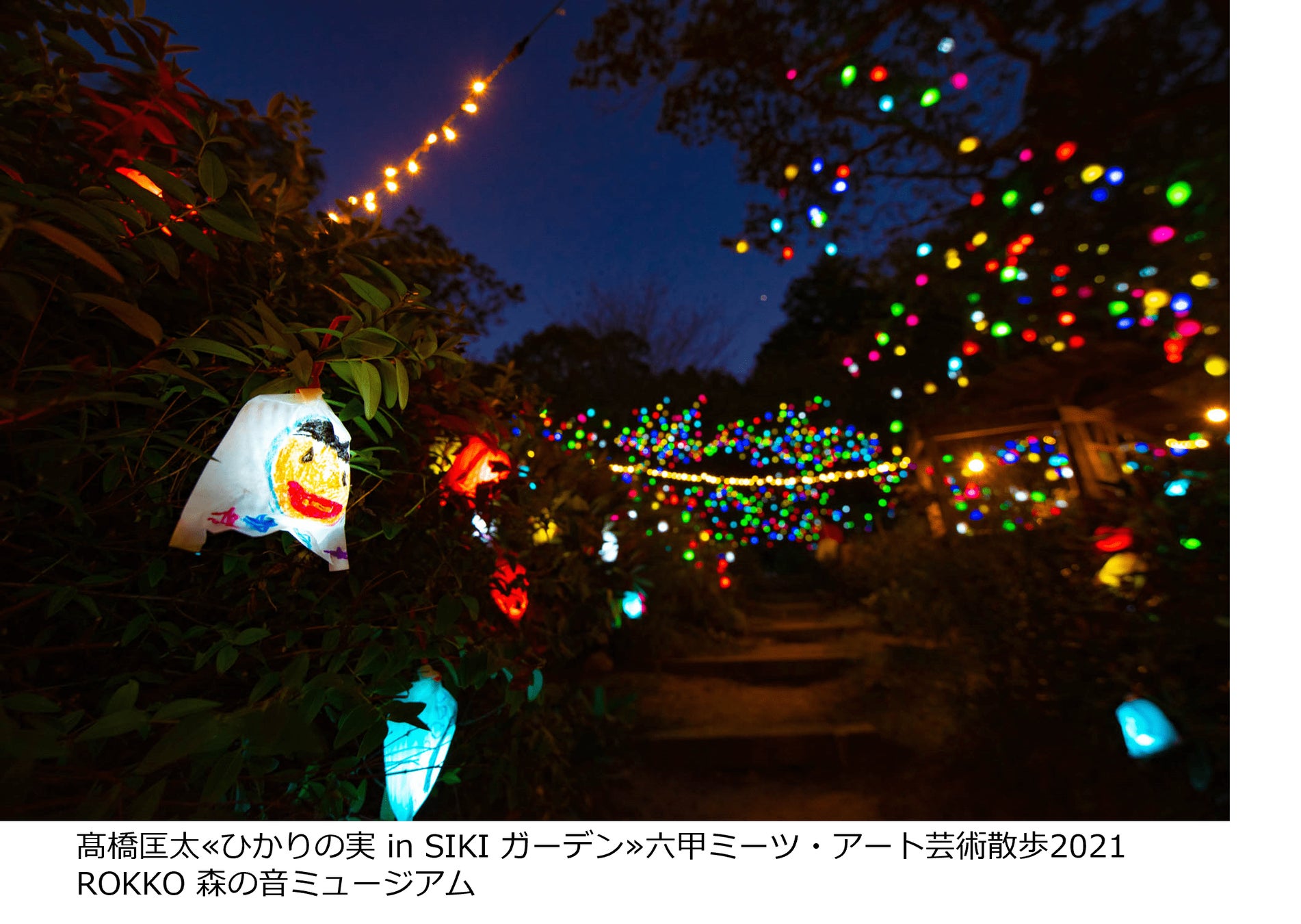 これまで「ザ・ナイトミュージアム~夜の芸術散歩~」として期間限定で六甲高山植物園とROKKO森の音(ね)ミュージアム等で夜間延長営業を行い、夜の作品をお楽しみいただいた当企画が、この度期間、料金設定、及び名称を改め「ひかりの森~夜の芸術散歩~」として新たに開催します。ライトアップされた“夜の幻想的な六甲山”を長くお楽しみいただくため、例年より約1ヵ月早く開始し、野外でも過ごしやすい季節からご鑑賞いただけます。今年も照明や映像を巧みに操って光の可能性に挑んでいるアーティスト、髙橋匡太がROKKO森の音ミュージアムで参加型の光の作品「ひかりの実in SIKIガーデン」を展示し、六甲高山植物園でも光を用いた新作を展示します。