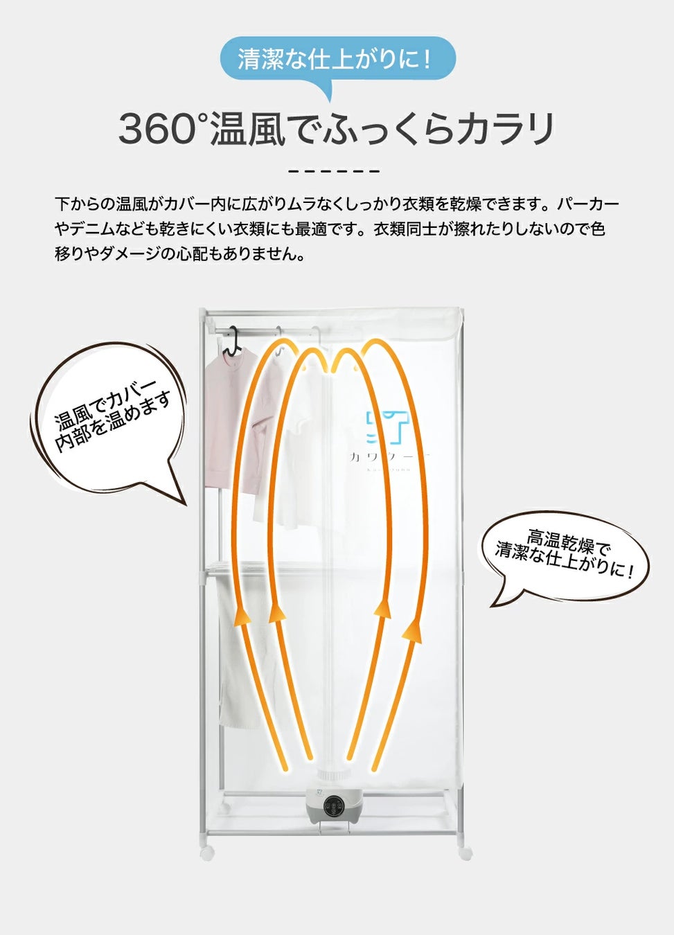 寒くて乾きにくい冬や梅雨の生乾き臭対策、花粉やホコリの付着をサポートする現役ママ考案の室内用乾燥機です。ラック下部にあるヒーターからBOX状のカバー内に設置した洗濯物へ高温熱風をあて、ふっくら、カラリと乾燥させます。
