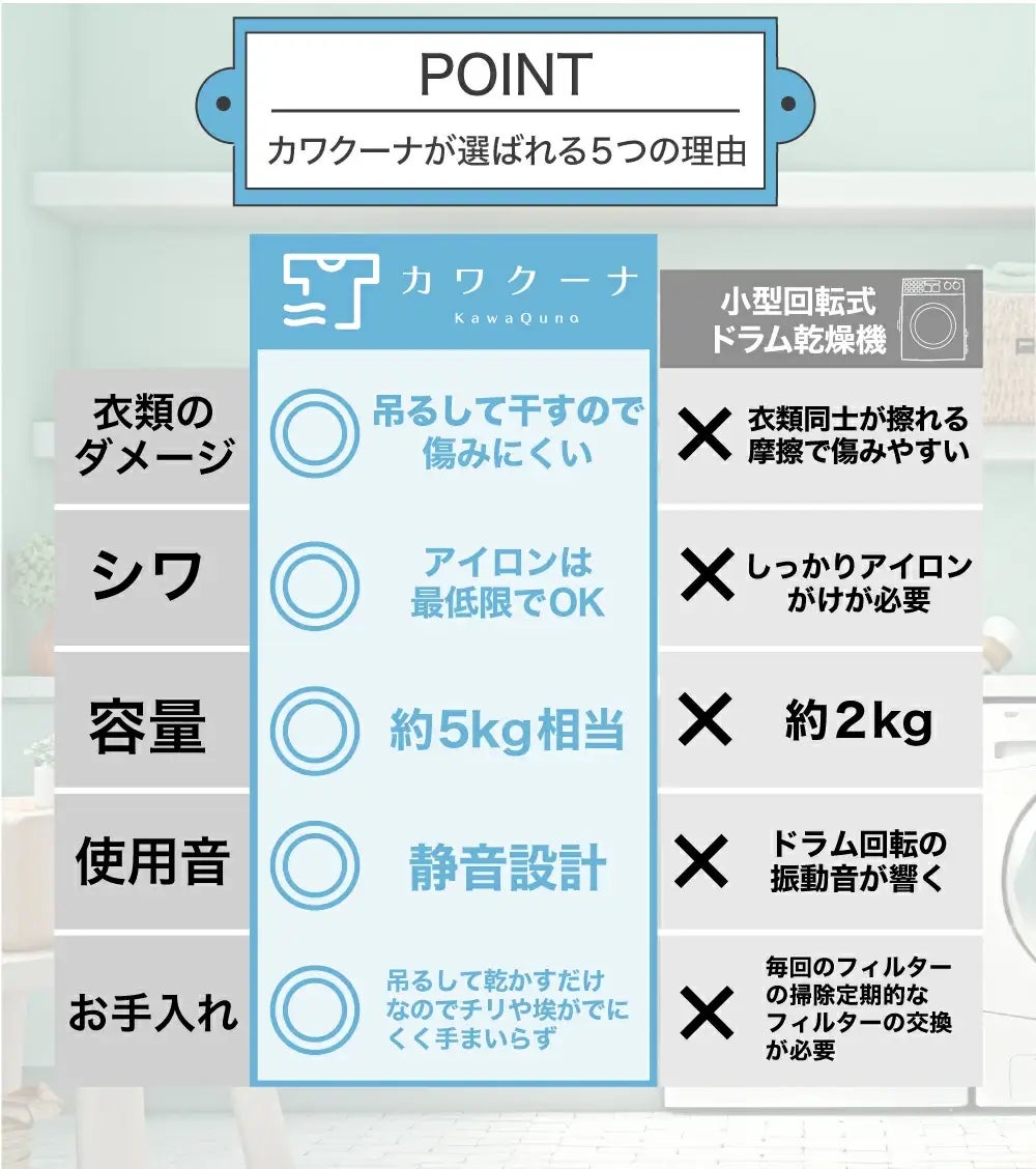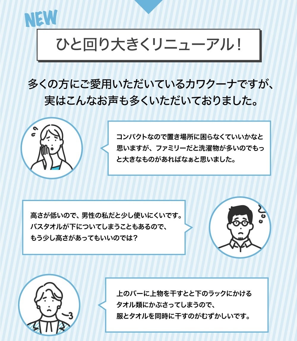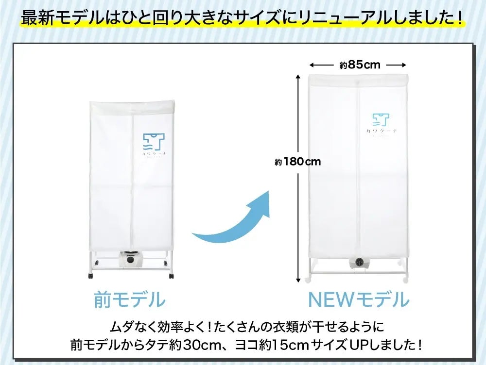 ユーザー様の声を受け、カワクーナは2023年12月にサイズを一回り大きくリニューアル!これにより、容量が大幅にアップし、これまで以上にたくさんの衣類を、一度に効率よく乾燥できるようになりました。家族みんなの洗濯物がしっかり乾く、頼れる一台です。
