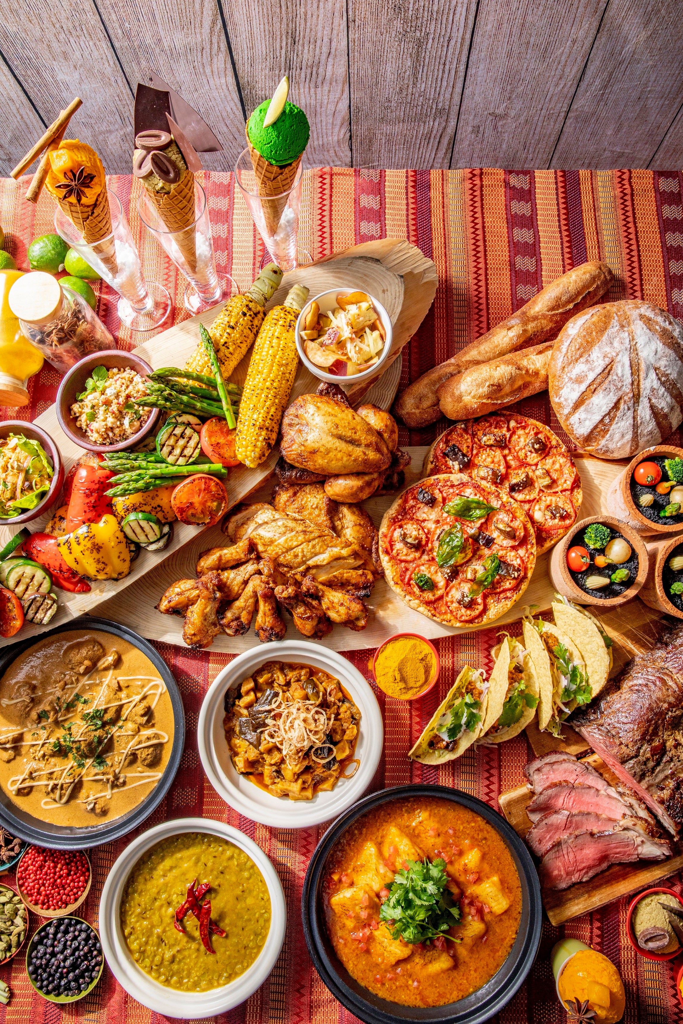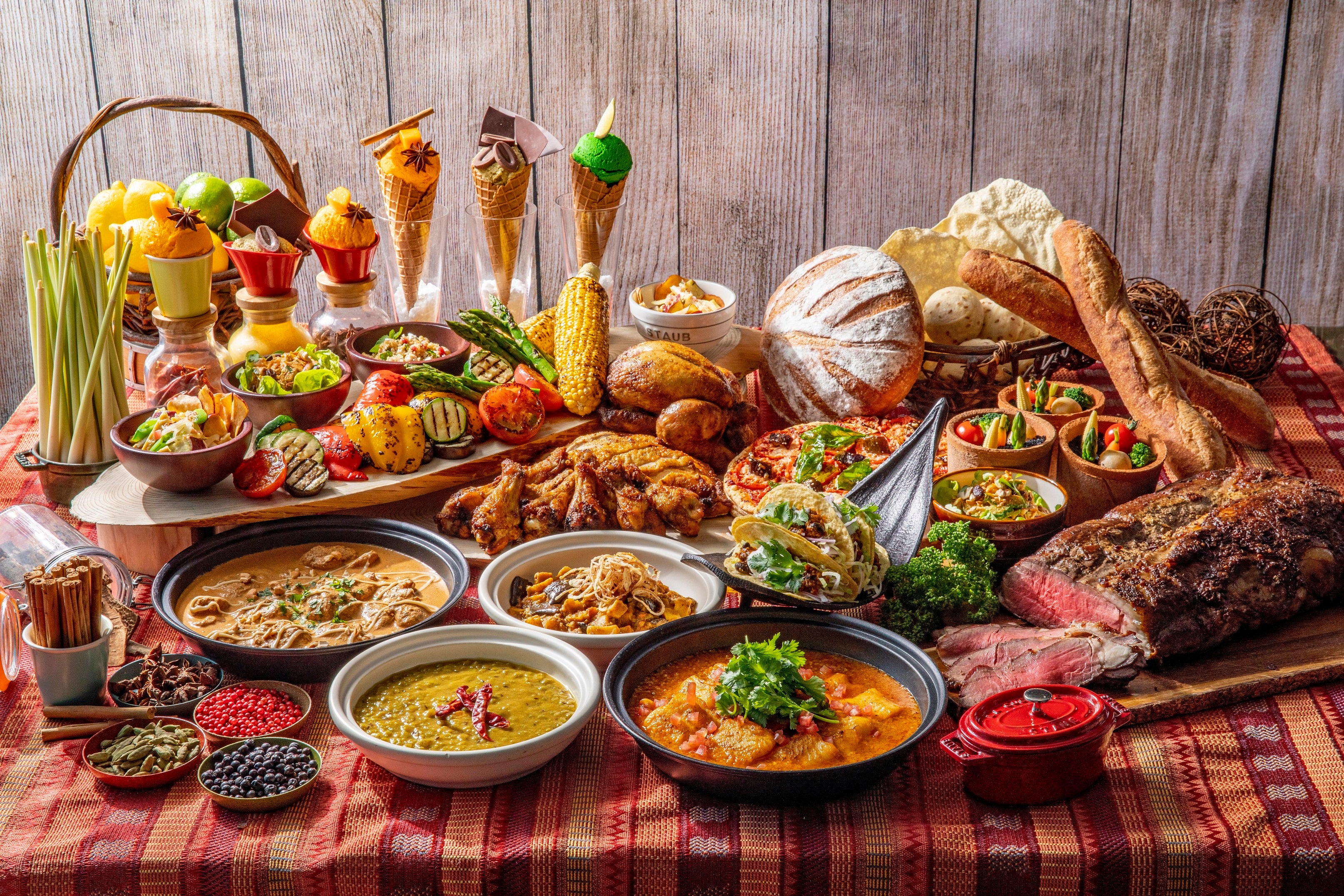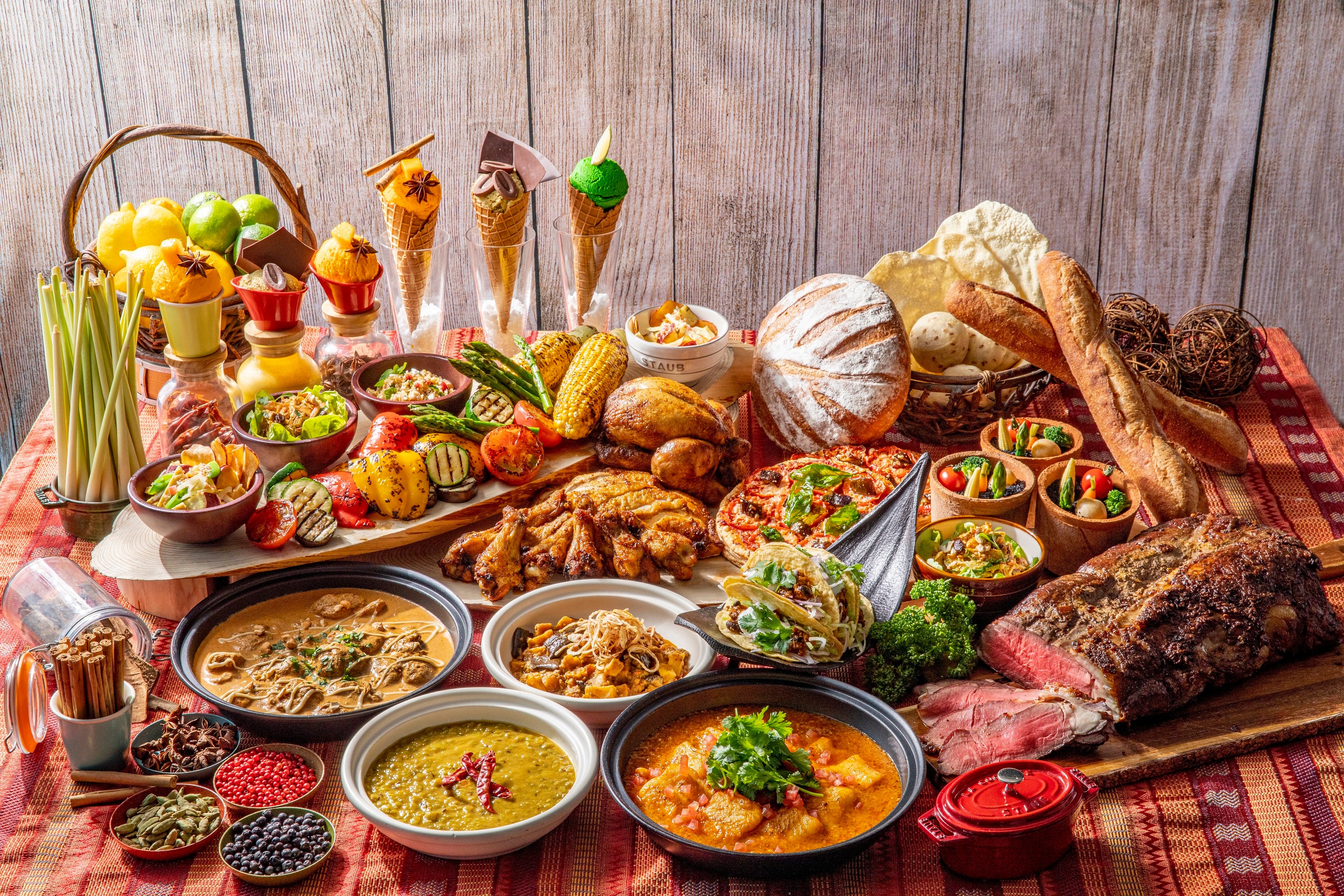 4種類の ひねりを効かせた カレー &スパイスアイス、ローストビーフ、サラダなど約 80 種類 が揃う夏のランチビュッフェ