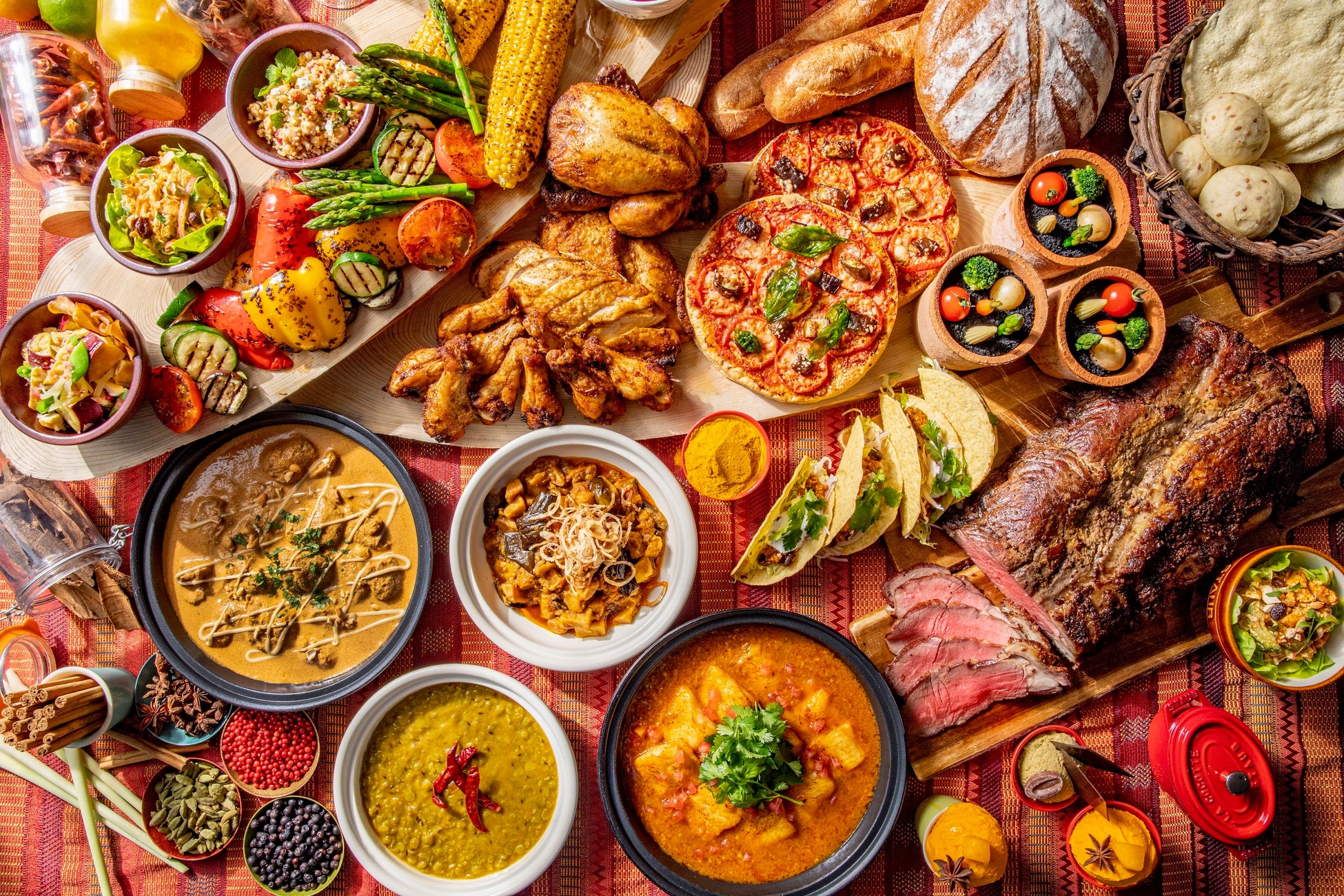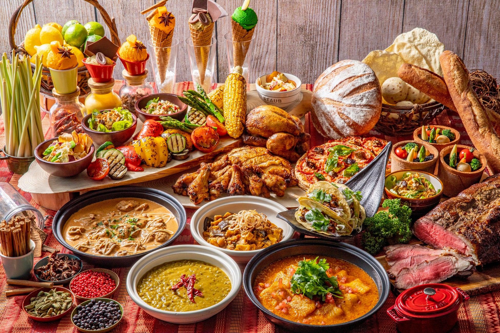バラエティ豊かな料理が揃うランチビュッフェには、シェフが目の前で切り分ける「ローストビーフ マスタードグレービーソース」、「ラム肉の赤ワイン煮」、「タンドリーチキン」、「ガーリックシュリンプ&シーフード」など目移りするお料理が並びます。ヘルシーアイテムも多数取り揃えており、「大豆ミートのチリコンカン タコス」や「トマトと茄子のタルト」、「和風コブサラダ」や「ローストスイートポテトサラダ」、12種類以上のフレッシュ野菜が揃うサラダバーなどもお楽しみいただけます。